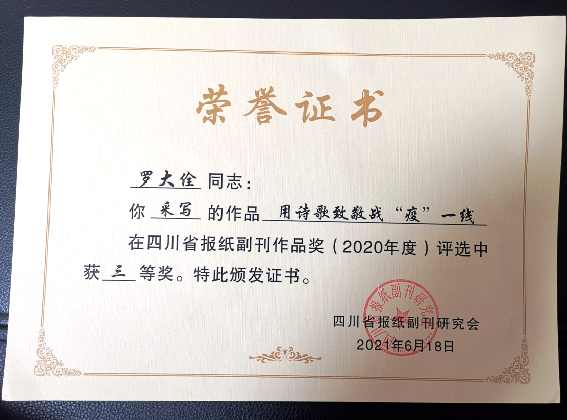 四川省报纸副刊作品奖(2020年度)作品评选已经结束,中国作家协会会员、学院图书馆馆长罗大佺的诗歌《母校为你点赞》荣获三等奖。 《母校为你点赞》是描写beat365英国官方网站毕业学子彭云耀在武汉疫情暴发后,作为四川...