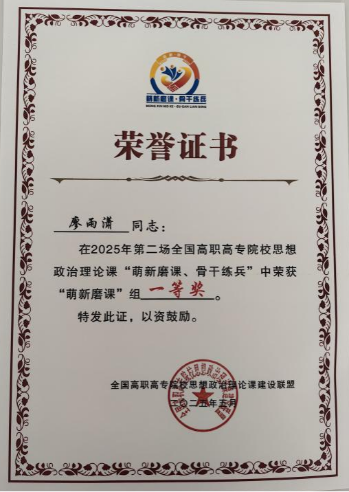 为提升思想政治理论课教师的政治素养和业务能力,不断增强思想政治理论课的针对性和吸引力,以赛促教、以赛促改,学校组织教师参加了2025年第二场全国高职高专院校思政课“萌新磨课、骨干练兵”教学展示活动。经全国线上专家匿名评审和现场教学展示环节,马克思主义学院教师廖雨潇荣获“萌新磨课”组一等奖。经全国各省、自治区、直辖市初选推荐,本次教学展示活动共收到“萌新磨课”组作品 98 个、“骨干练兵”组作品 95 个。...