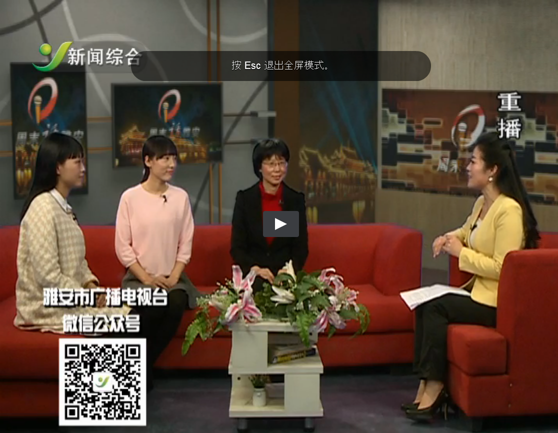 【本网讯】3月6日晚,我院护理系青年教师闵捷与雅安市妇女联合会主席赵雅玲、地税局何璐宏一起做客雅安电视台“周末话雅安”栏目。本期的主题为“话家风”,主持人就“家风是什么”、“家风对你的影响”、“如何传承家风”同三位嘉宾进行了访谈和交流。