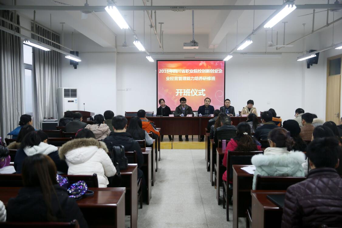【本网讯】1月8日上午,由我院旅游经济管理系和新道科技股份有限责任公司联合举办的2016年四川省职业院校创新创业企业经营管理能力培养研修班开班仪式在我院青年路校区图903举行。新道科技股份有限责任公司四川分公司副总经理瞿刚、项目经理杜秋红,我院党委书记张大凯、纪委书记谭宏、教务处处长彭裕红及来自全省各个市州的20余所中职学校的40余名参培教师参加了开班仪式。