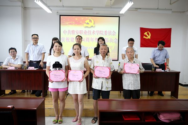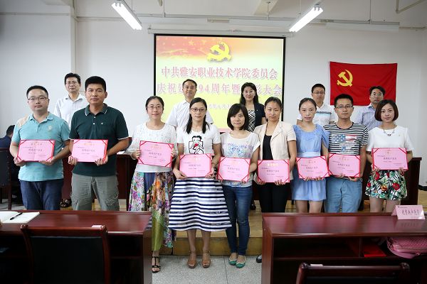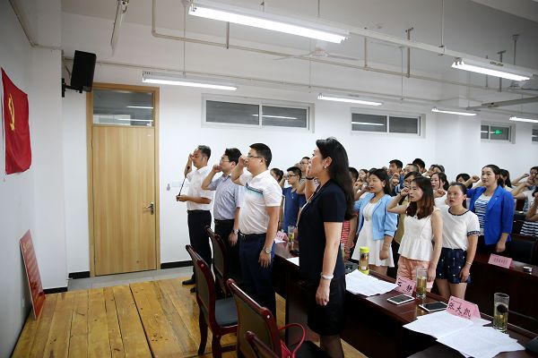 【本网讯】6月30日下午,学院党政班子成员、在职教职工党员代表、离退休党员代表、新党员代表90余人佩戴着党徽,在青年路校区图书综合楼903会议室隆重集会,庆祝建党94周年,共同缅怀党的光荣历史,弘扬党的优良传统,并通过新党员宣誓、老党员重温誓词、表彰先进党员等活动,进一步加强党员党性修养,践行 “三严三实”要求,坚定理想信念,夯实贯彻落实“四个全面”战略的思想基础,以推动学院建设发展。党委副书记、院长石静主持大会。