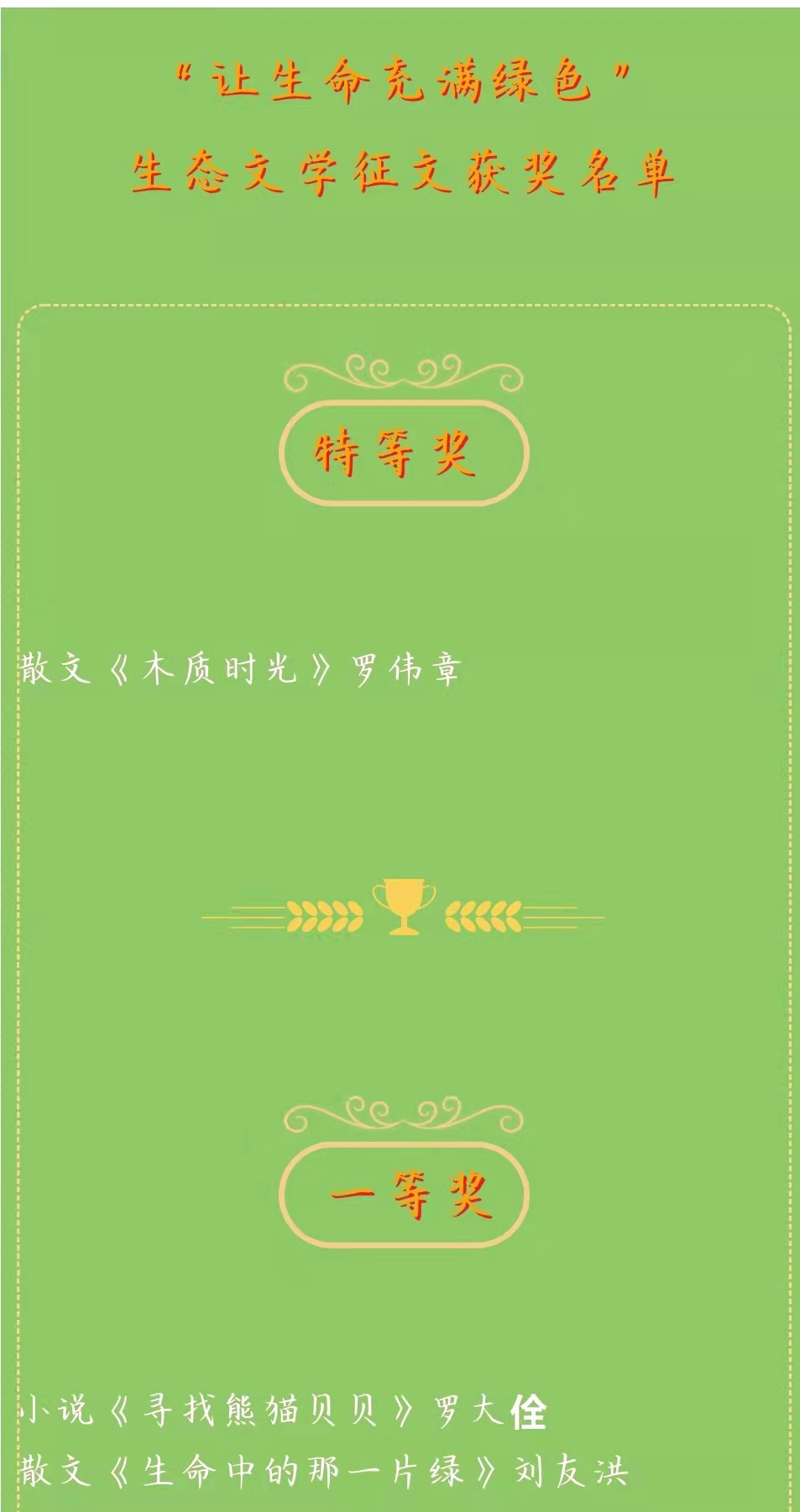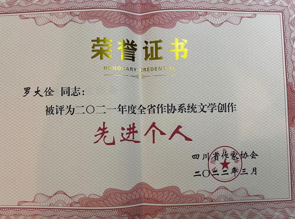 近日,我院教师、机关后勤第三党总支第三党支部书记罗大佺荣获四川作协系统文学创作多个荣誉,包括:荣获四川省作家协会颁发的“二〇二一年度文学创作先进个人,当选四川省作家协会第九届报告文学委员会委员;他的短篇小说《寻找熊猫贝贝》在中国林业文联主办、《生态文化》杂志社承办的“让生命充满绿色”全国生态文学征文中荣获一等奖。