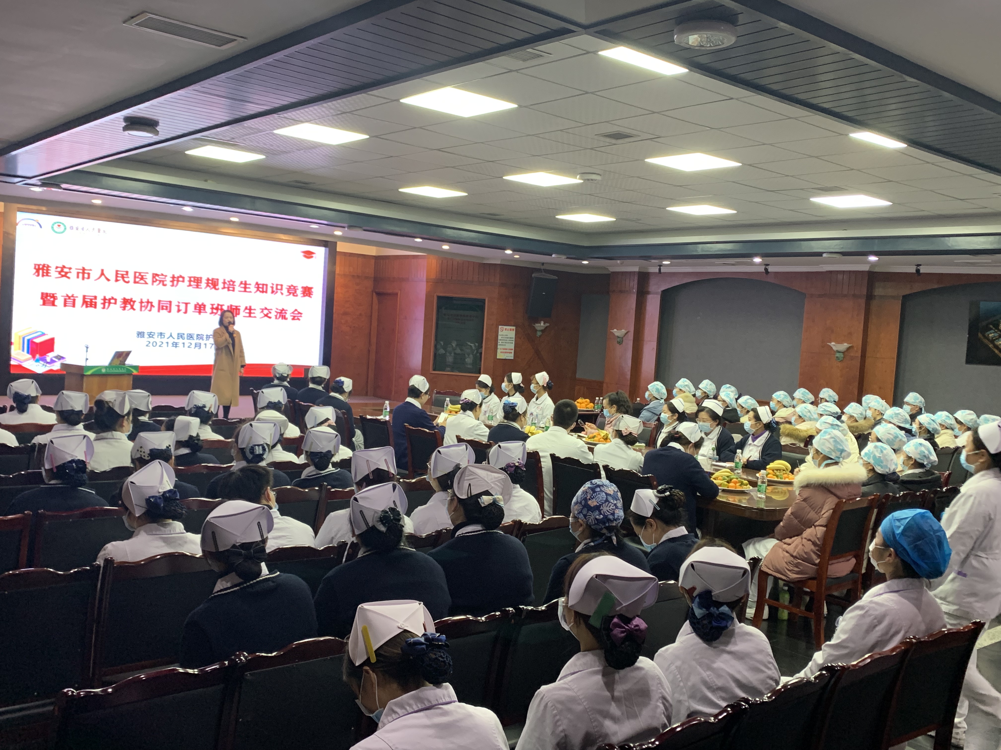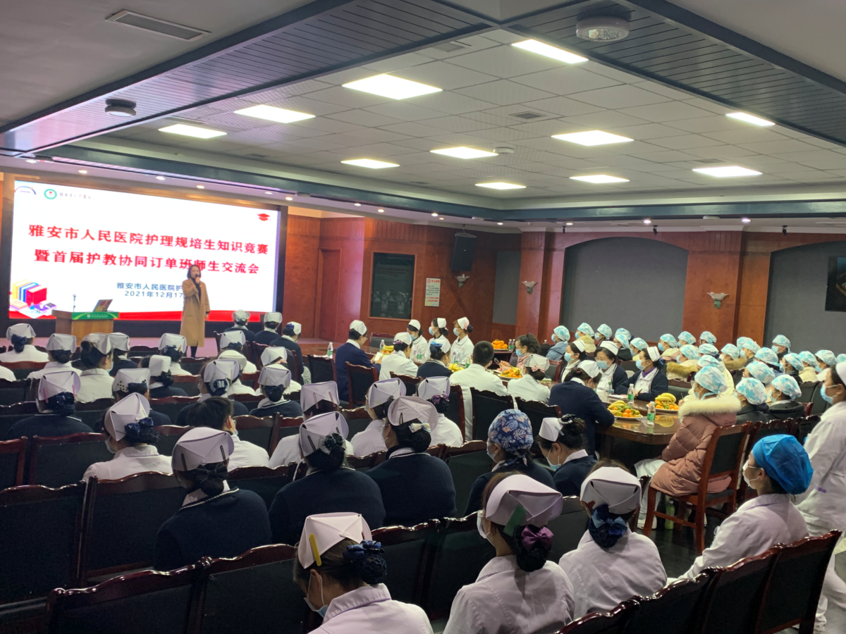 12月17日下午,雅安市人民医院护理规培生知识竞赛暨首届订单班师生交流会在雅安市人民医院学术报告厅举行。雅安市人民医院护理部主任胡盛琳、副主任周昀霞,呼吸与危重症学科、血液科、肾脏风湿免疫科、心血管内科等科室的带教老师,护理学院副院长李婧,教研室主任陈俊,以及规培生和订单班全体同学参加开班仪式。