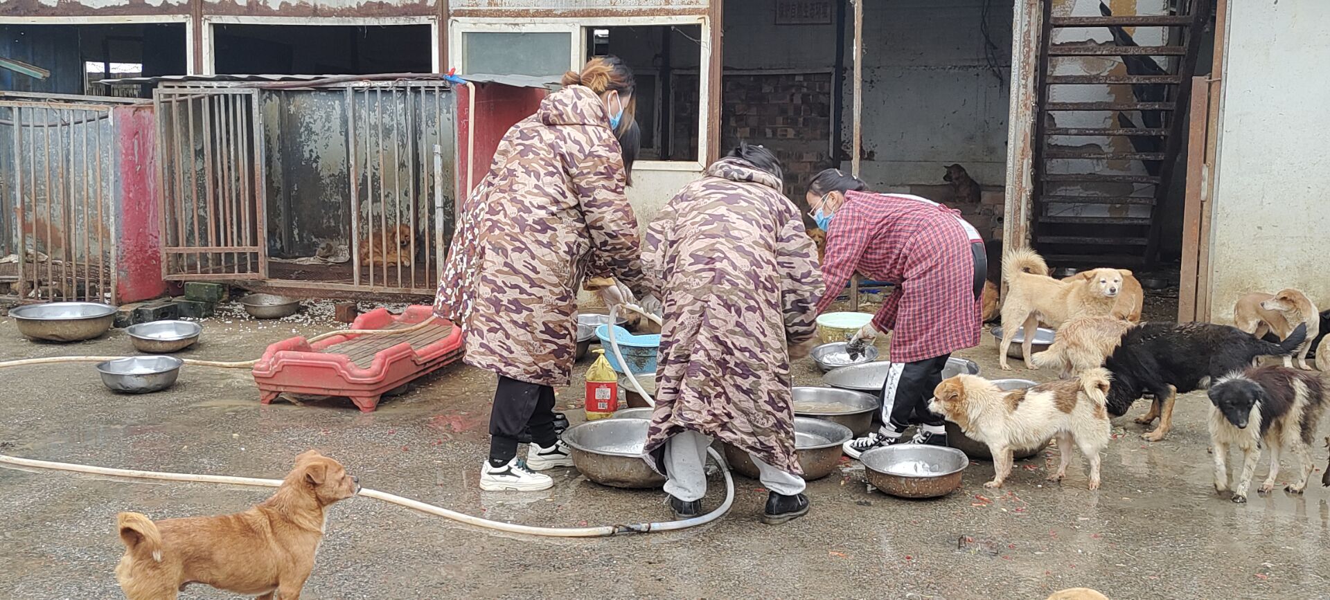 在雅安市流浪动物基地,志愿者们将前期通过募捐收集到的猫粮、狗粮以及一些旧衣服、旧被子交给基地负责人后,便挽起衣袖清洗供动物使用的食具,搬运狗粮,打扫环境卫生,带小动物们四处玩耍。