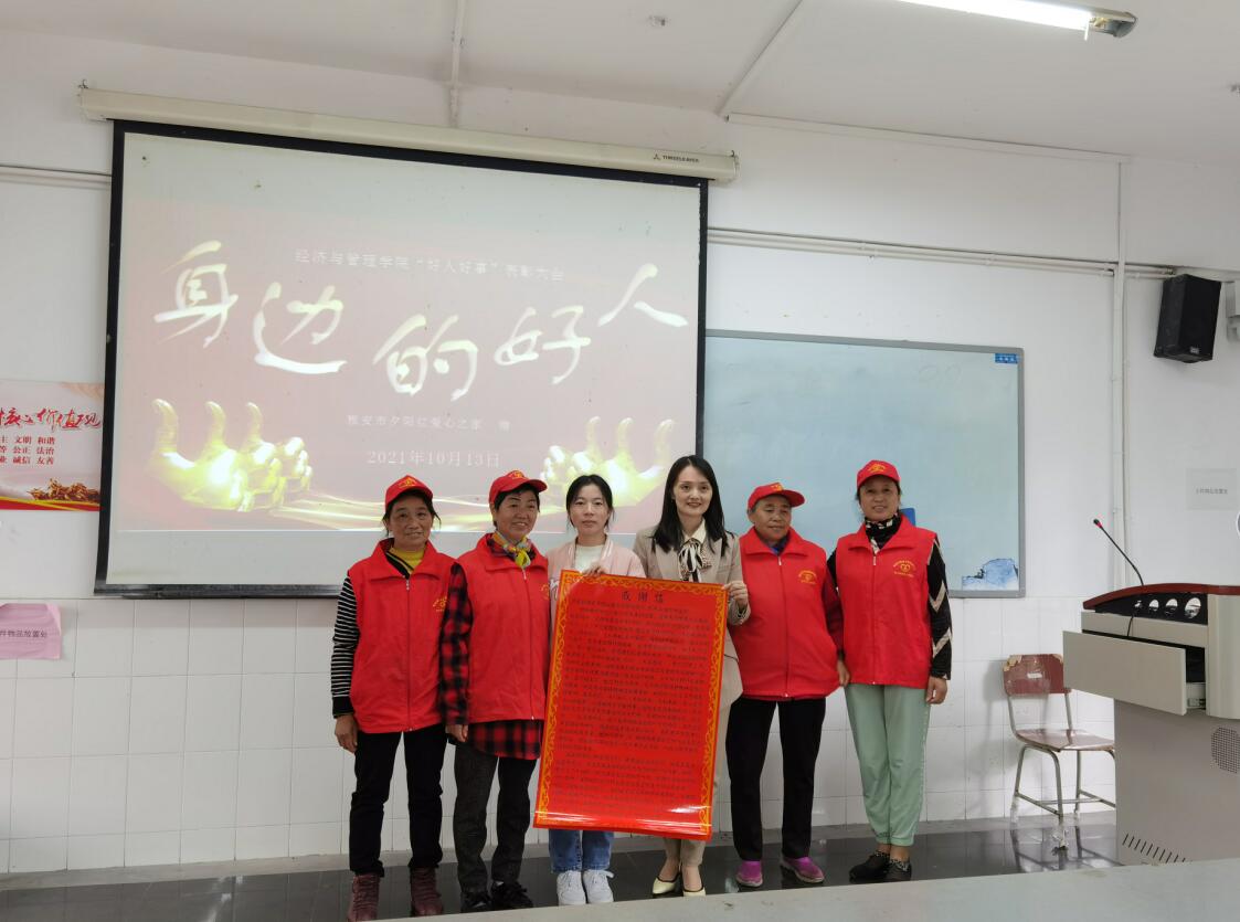 会上,雅安市夕阳红爱心之家的志愿者介绍了“乐于助人好青年”——2020级普专旅游管理专业2班肖欢的事迹,并宣读了对肖欢及学院的感谢信。