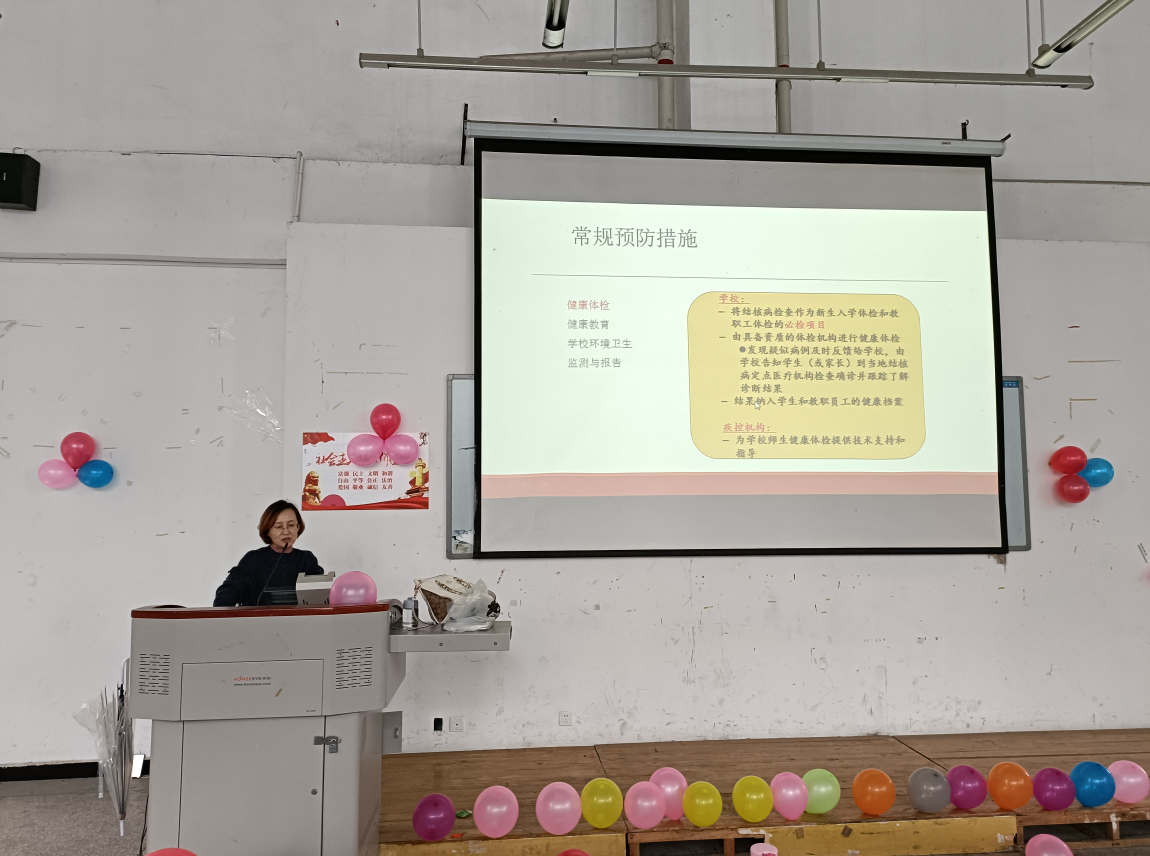 讲座通过视频给大家介绍了肺结核病的发病概况;对结核病的定义、结核病的特征、传播途径、防治办法、就医途径等相关知识和进行了详细的讲解。最后,呼吁同学们平时应养成良好的生活习惯,不随地吐痰,经常开窗通风,保持室内空气新鲜,适当的户外活动和体育锻炼,增强体质,提高抵抗力。