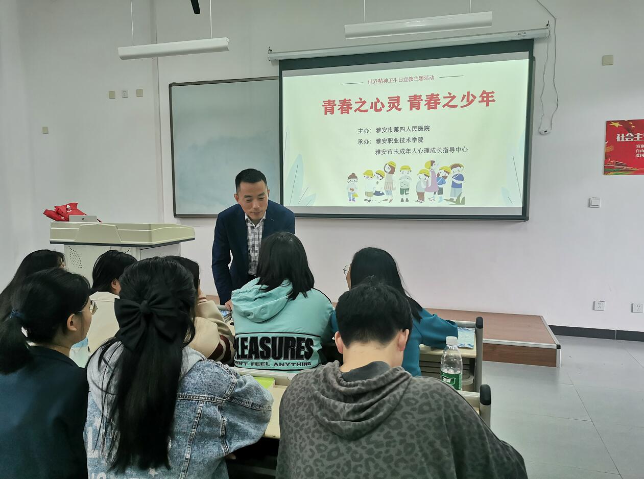 在 10月10日世界精神卫生日来临之际,为帮助在校大学生掌握心理健康相关知识,提升心理调适能力,10月9日马克思主义学院联合雅安市第四人民医院在经开区校区共同举办主题为“青春之心灵 青春之少年”的世界精神卫生日科普宣传活动。活动邀请了雅安市精神卫生中心、雅安市第四人民医院医学专家们参加,心理健康知识宣传覆盖近200余名学生。