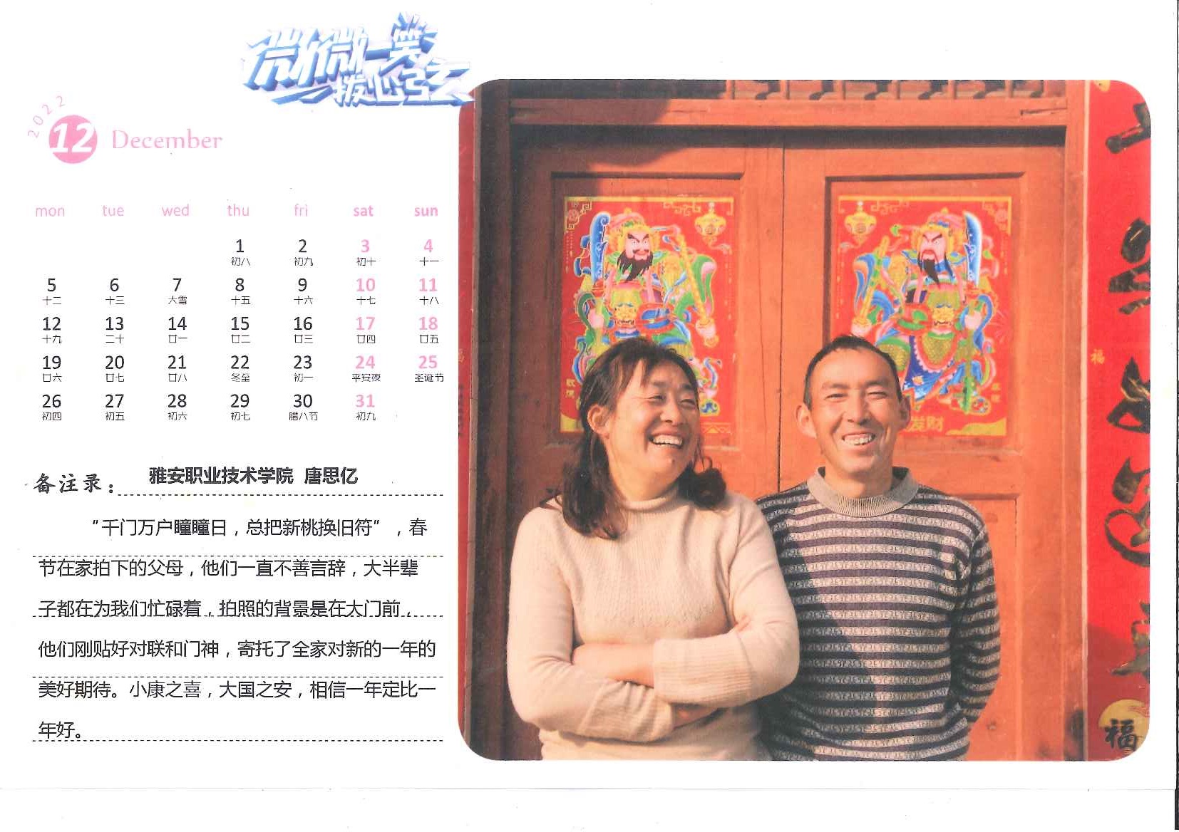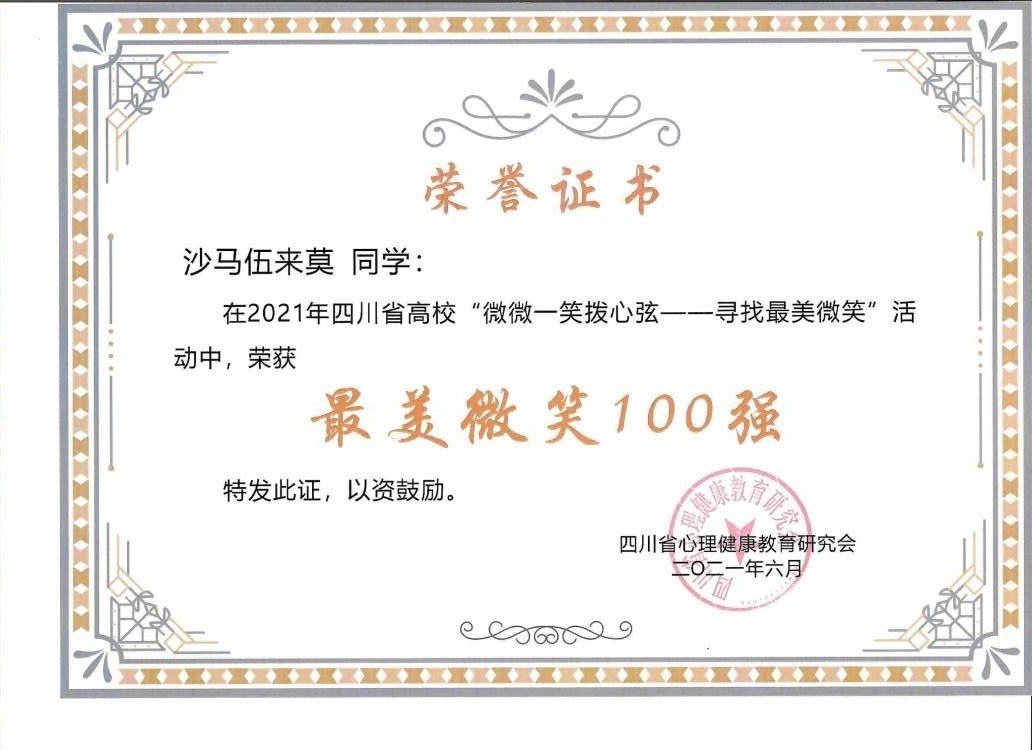 学院积极组织开展活动,接到各二级学院推荐报送作品101件,通过选拔后推送22组优胜作品参加比赛。经过四川省高校专业评审组的认真评审与“最美微笑墙”的互动投票,最终于师范学院学生唐思亿同学的摄影作品《年味》荣获了摄影作品征集三等奖,吴英巧与沙马伍来莫同学均获“最美微笑100强”称号。