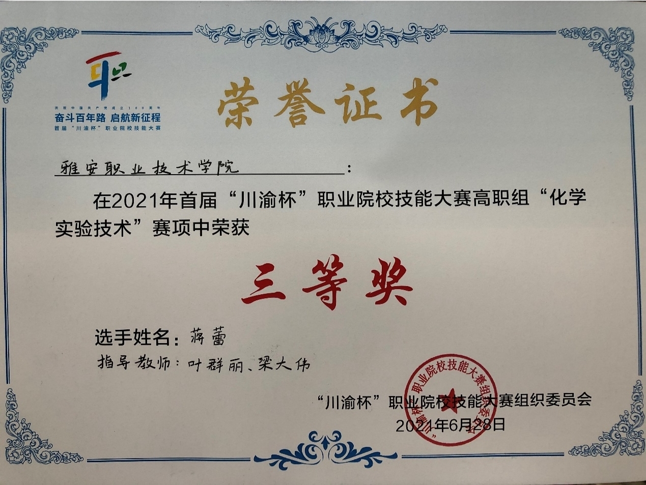 药检学院19级药学专业蒋蕾同学参赛,经过2天3个子赛项的激烈角逐,蒋蕾同学获得三等奖的优异成绩。药检学院高度重视本次比赛,蒋蕾同学在老师们的精心指导下,全面备战,克服竞赛时间紧、综合性强、难度大等困难,赛场上沉着迎战,随机应变,顺利完成各项目。