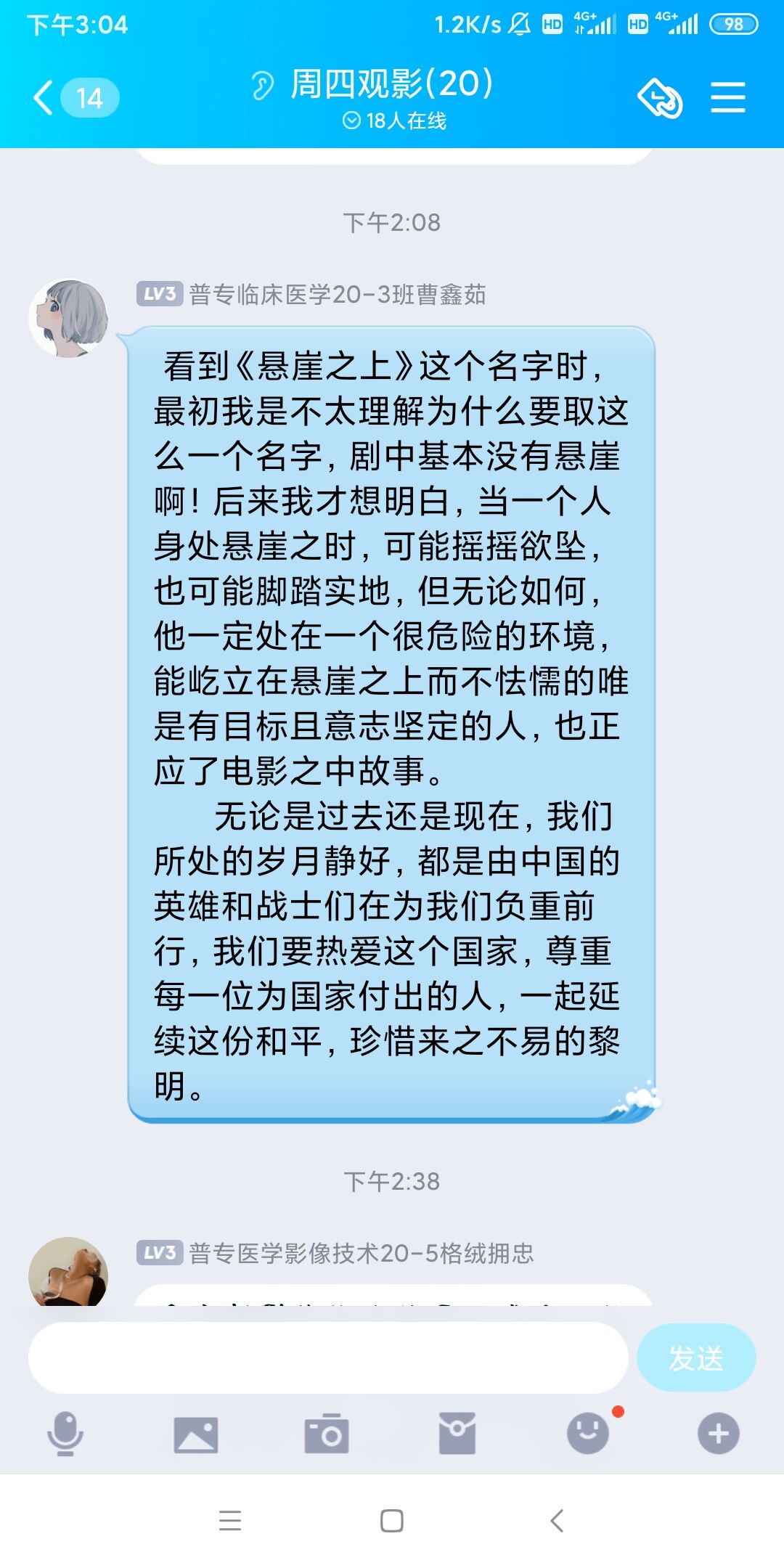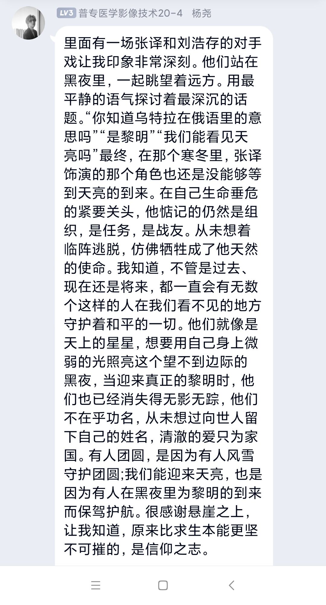 本次观影的《悬崖之上》是张艺谋导演的谍战类型爱国大片,致敬为了民族主义将生死置之度外的革命先烈。本次观影活动增强了学生们的爱国情怀,让同学们倍受鼓舞,纷纷表示要牢记历史,倍加珍惜和守护当前来之不易的生活,扎实专业知识,为建设社会主义现代化强国贡献青春力量。