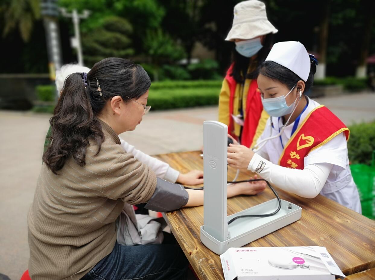 身着红色志愿服和白色护士服的志愿者们有序开展了义诊活动 。一部分志愿者负责调查回访,一部分志愿者细心的为居民测量血压,并进行了手指操和七步洗手法的讲解。志愿者热情的服务得到了居民们的一致好评。