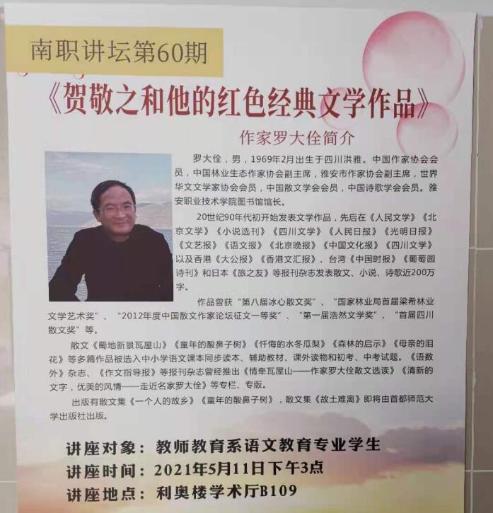 5月11日,中国作家协会会员、中国林业生态作家协会副主席、雅安市作家协会副主席、学院图书馆馆长罗大佺应邀到南充职业技术学院为师生作文学讲座。讲座以《贺敬之和他的红色经典文学作品》为题,分析了贺敬之文学作品的磅礴气势和照亮民族精神的火炬职责,描述了一批红色作家响应毛泽东主席《在延安文艺座谈会上的讲话》,深入生活,创作出各个时期影响巨大的主旋律作品,红色文学作品是实现中华民族伟大复兴的精神力量。在中国共产党建党一百周年,全国上下掀起学党史、强信心、跟党走的热潮之际,高校大学生更要牢记红色记忆,深化红色经典文学作品的学习。讲座中,罗大佺还阐述了贺敬之红色经典文学作品对文艺界产生的影响,介绍了贺敬之先生的革命文艺生涯。