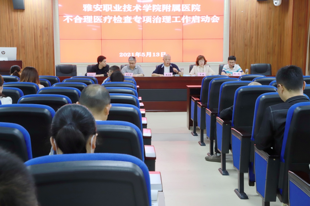 为切实规范医疗行为,改善人民群众就医体验,按照《雅安市卫生健康行业领域不合理医疗检查专项治理实施方案》要求,5月13日,beat365英国官方网站附属医院在门诊十楼学术厅召开不合理医疗检查专项治理工作启动会,学院党委委员、副院长、临床医学院(附属医院)党总支书记樊正康出席会议,全体班子成员及中层干部参加,会议由临床医学院(附属医院)副院长何跃主持。