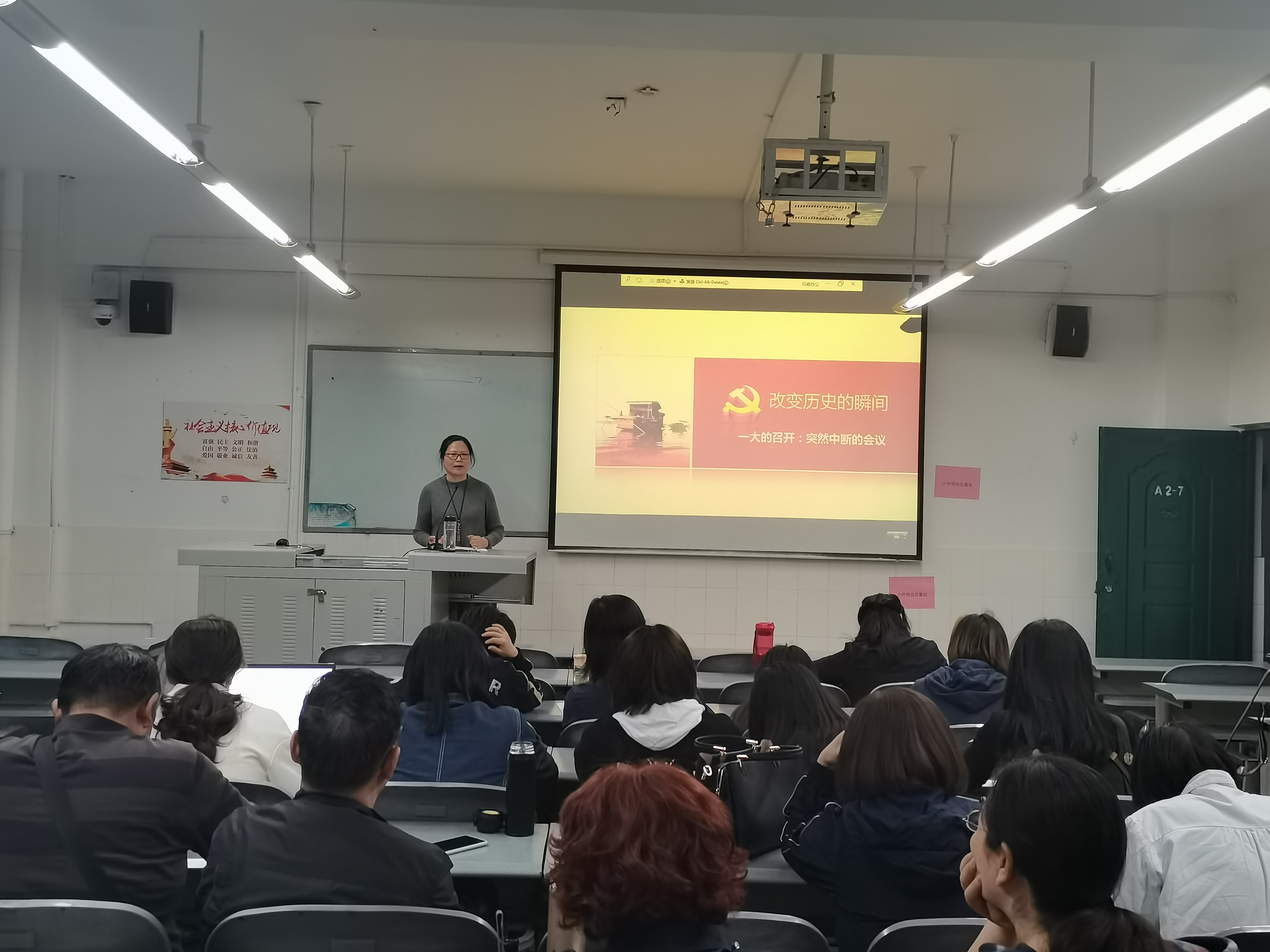 会上,李霓强调了党史学习的重要性,分别从欲知大道、必先为史,不忘初心、方得始终,汲取力量、砥砺前行等方面讲述了为什么要学好党史这门必修课。她强调,在中国共产党100年华诞到来之际,思政部全体党员、教师应发挥学科优势,学党史、颂党恩、讲党史、跟党走。随后,李霓以《改变历史的瞬间》为题,用丰富的党史知识和扎实的理论功底,深入浅出地讲述了中国共产党的起点和初心。在她的讲解下,全体党员、教师重温了历史记忆,更加深刻理解了中国共产党人的使命。