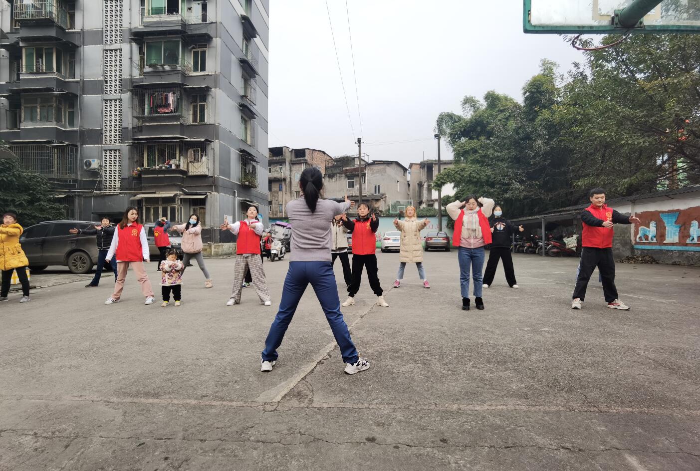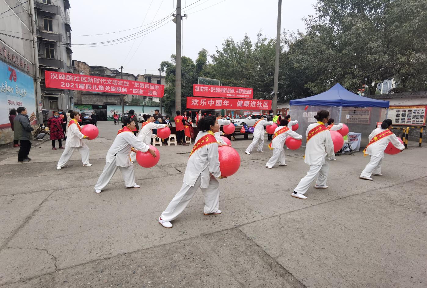 活动现场,志愿者们挂灯笼、拉横幅、写福字、送对联,为社区居民送上新春祝福。来自护理学院的专业教师杨宗莉、彭玉娇为社区居民测量血糖、血压,宣讲健康防疫小常识;雅韵大学生艺术团的同学给居民们带来了热情洋溢的新春舞蹈;康养学院体育教研室主任何莉带领大家跳起了活力四射的健美操,社区居民舞蹈队为大家表演了五行龙珠健身球操,现场活动丰富多彩,志愿者和社区居民积极互动,洋溢着喜庆、祥和的氛围。活动结束后,志愿者们对小区环境进行清扫,叶芋伶、郭庆和社区工作人员一起上门为两户行动不便的老人送上福字、对联,并送去新春祝福。