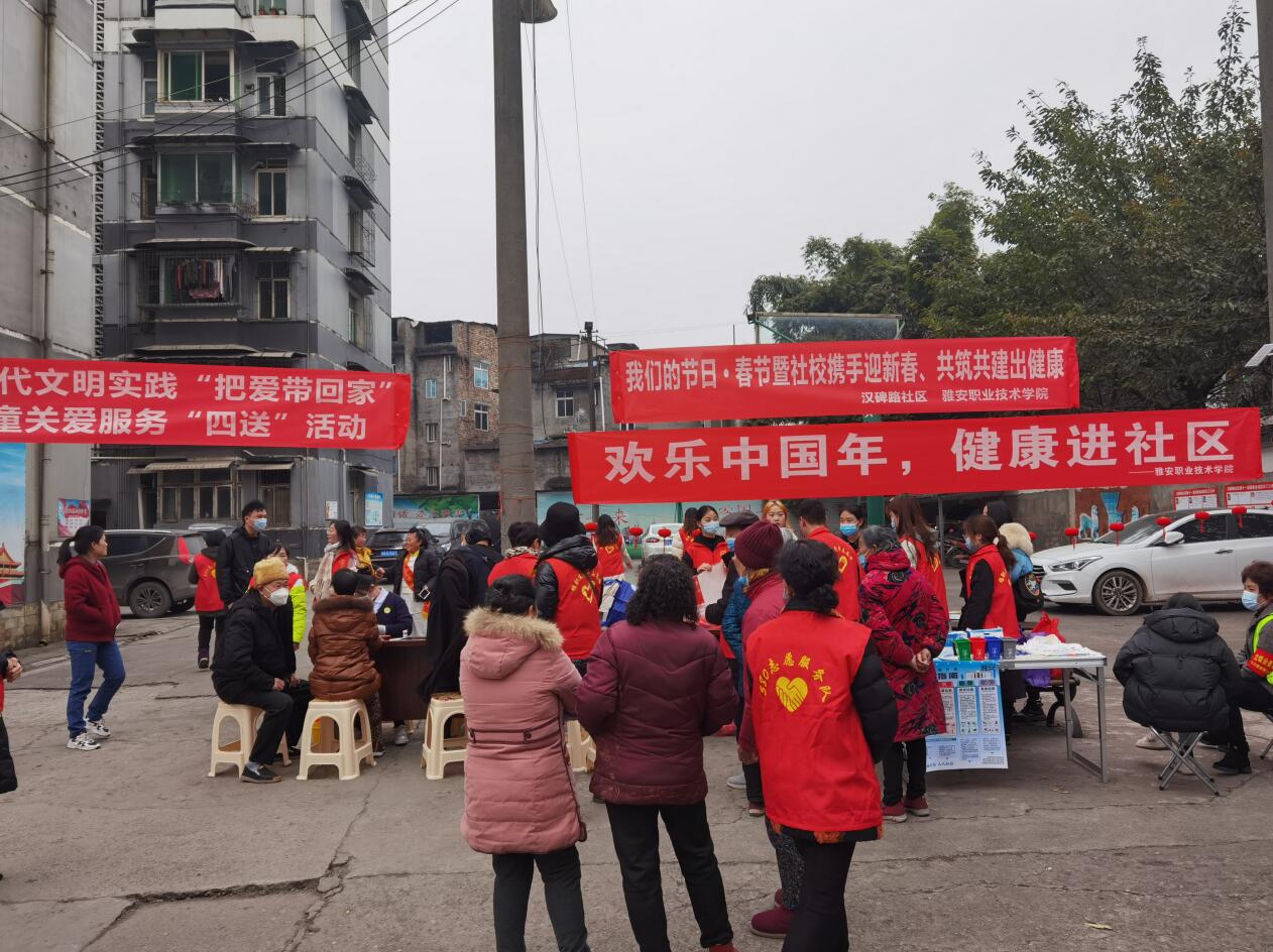 2月2日,学院师生志愿者20余人来到雨城区汉碑路社区和“联包帮”大院开展“欢乐中国年,健康进社区”春节志愿服务关爱行动。本次活动由院团委牵头,护理学院、康养学院共同参与,院团委副书记叶芋伶、郭庆,汉碑路社区副书记孟为民、吴文祺参加活动。