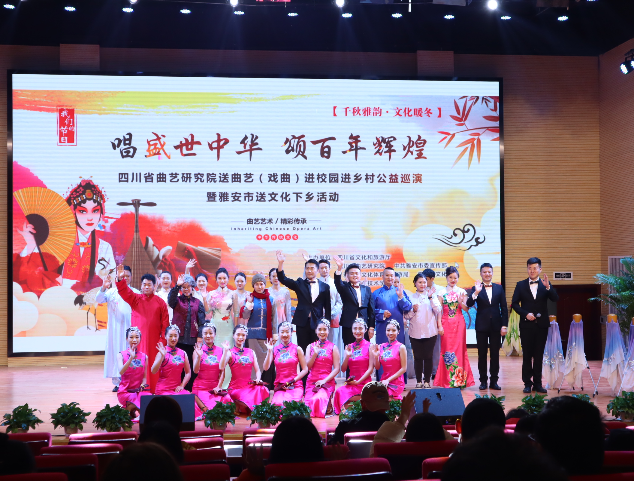 12月7日,由四川省文化和旅游厅主办,四川省曲艺研究院、中共雅安市委宣传部、雅安市文化体育和旅游局、雅安市文化馆和beat365英国官方网站联合举办的“唱盛世中华,颂百年辉煌”戏曲进校园巡演活动在我院经开校区聚雅厅顺利举行,200余名师生到场观看。