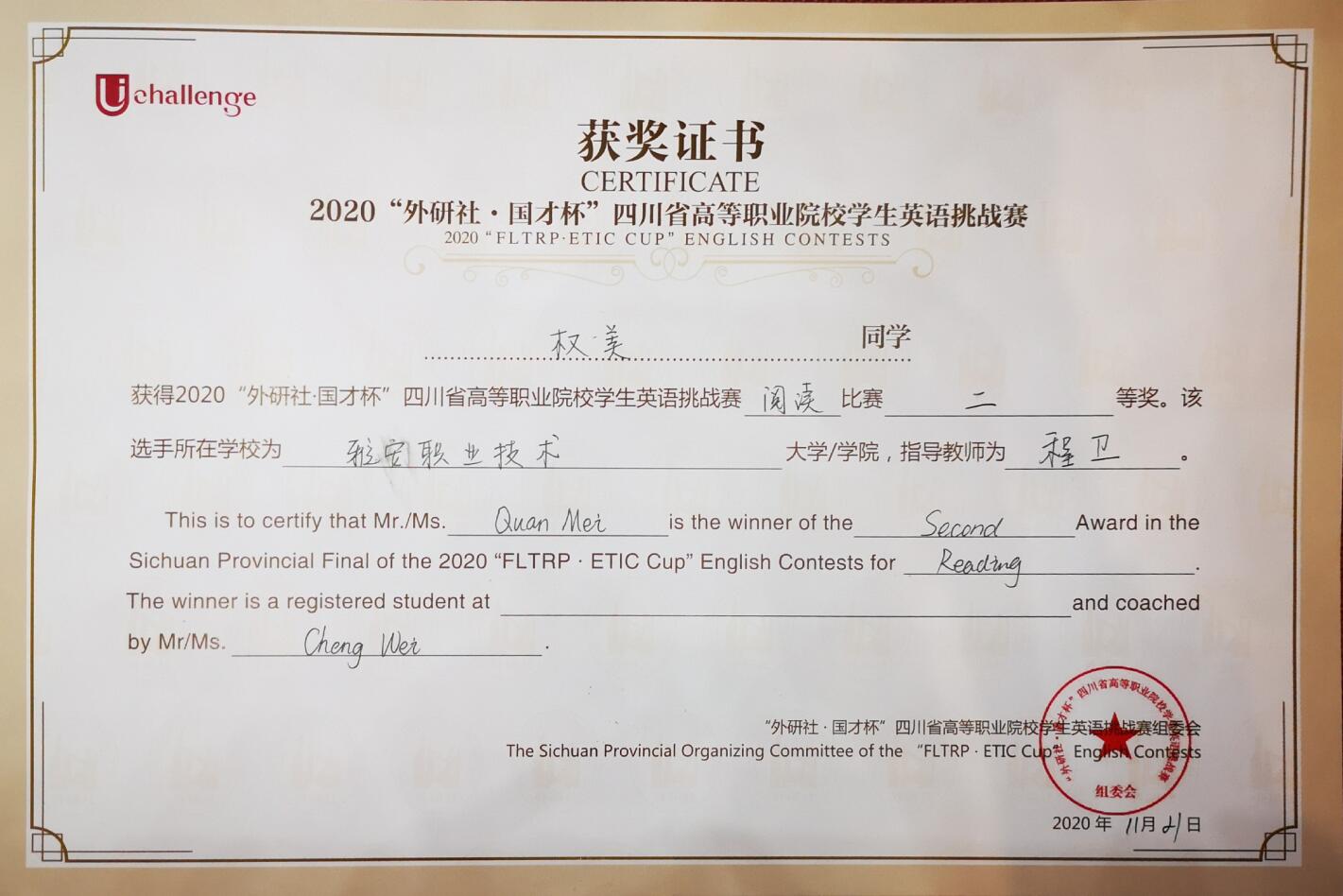 11月20日—22日,由四川省教育厅主办,外语教学与研究出版社、成都纺织高等专科学校承办的“2020年Uchallenge四川省高等职业院校学生英语挑战赛(四川省高等职业院校学生英语演讲大赛、英语写作大赛、英语阅读大赛)”在成都举行,来自全省62所高职高专院校294名从初赛中脱颖而出的选手参加了本次比赛。