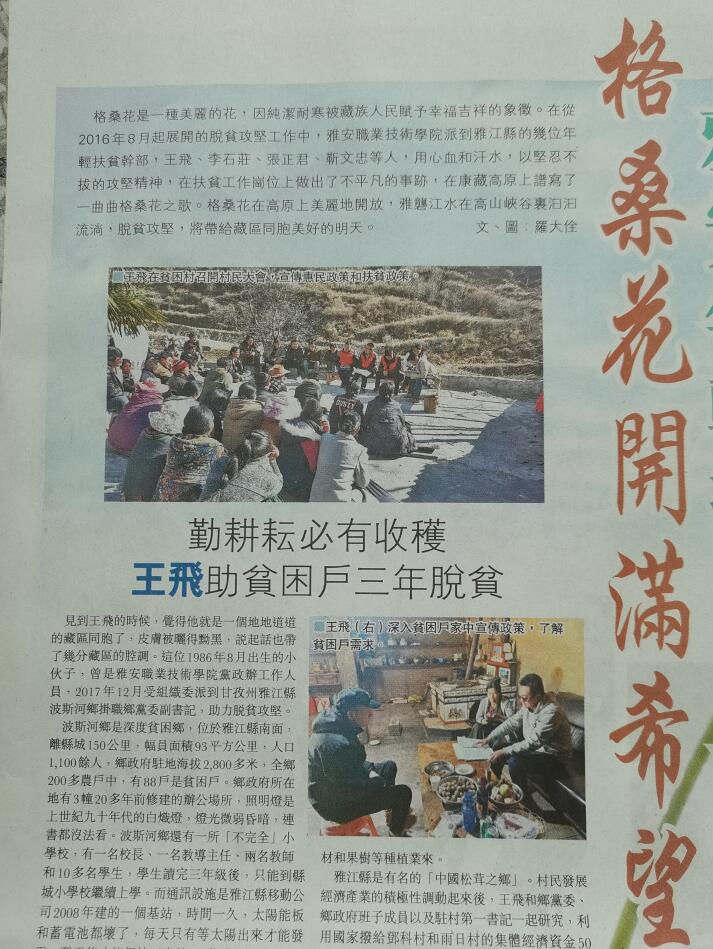 9月23日,《香港文汇报》(A17版)整版发表了学院图书馆馆长罗大佺的宣传beat365英国官方网站精准扶贫的报告文学《格桑花开满希望——雅安年轻扶贫干部情暖康藏高原》。该作品定位于国家脱贫攻坚的战略决策,生动描写了beat365英国官方网站干部王飞、李石庄等人用心血与汗水,在康藏高原的扶贫岗位上作出不平凡事迹,谱写出一曲曲格桑花之歌。作品感情真切而朴实,不仅表现了国家脱贫攻坚政策给当地带来的深刻变化,还有力地表现了beat365英国官方网站教师干部听从时代和国家召唤,勇于担当和奉献的精神风貌。
