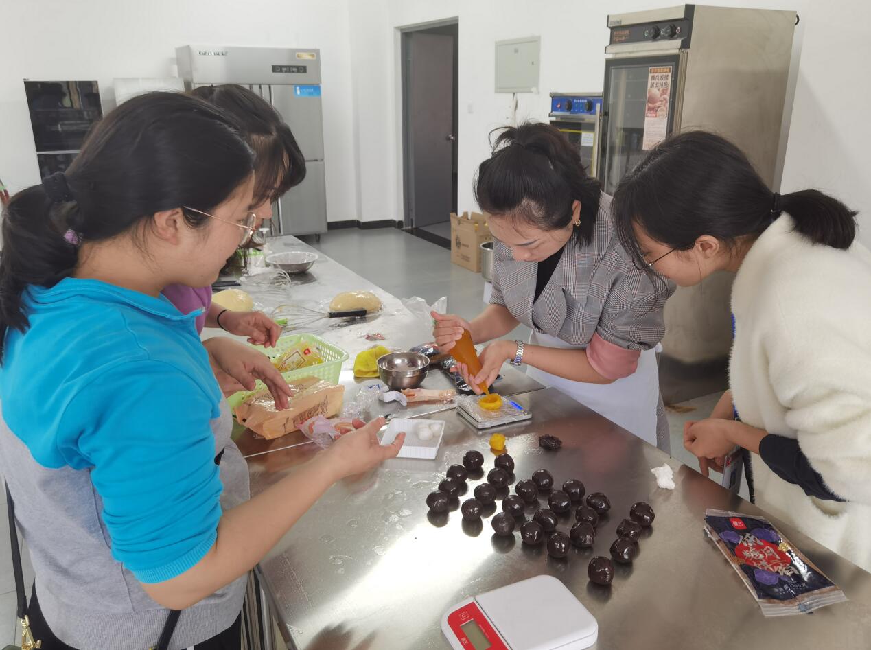 在食品专业张恒、杨冬雪老师的细心指导下,大家动手制作属于自己的月饼。经过称分量、擀面皮、包月饼、压模、烘焙等流程,一阵阵浓郁的香味飘散开来,一个个精致的月饼跃然于掌上。大家纷纷与自己手工制作的月饼合影,每个人脸上洋溢着幸福的笑容,现场充满浓浓的中秋氛围。月饼出炉后,大家共同品尝自己做的手工月饼,都觉得分外香甜。