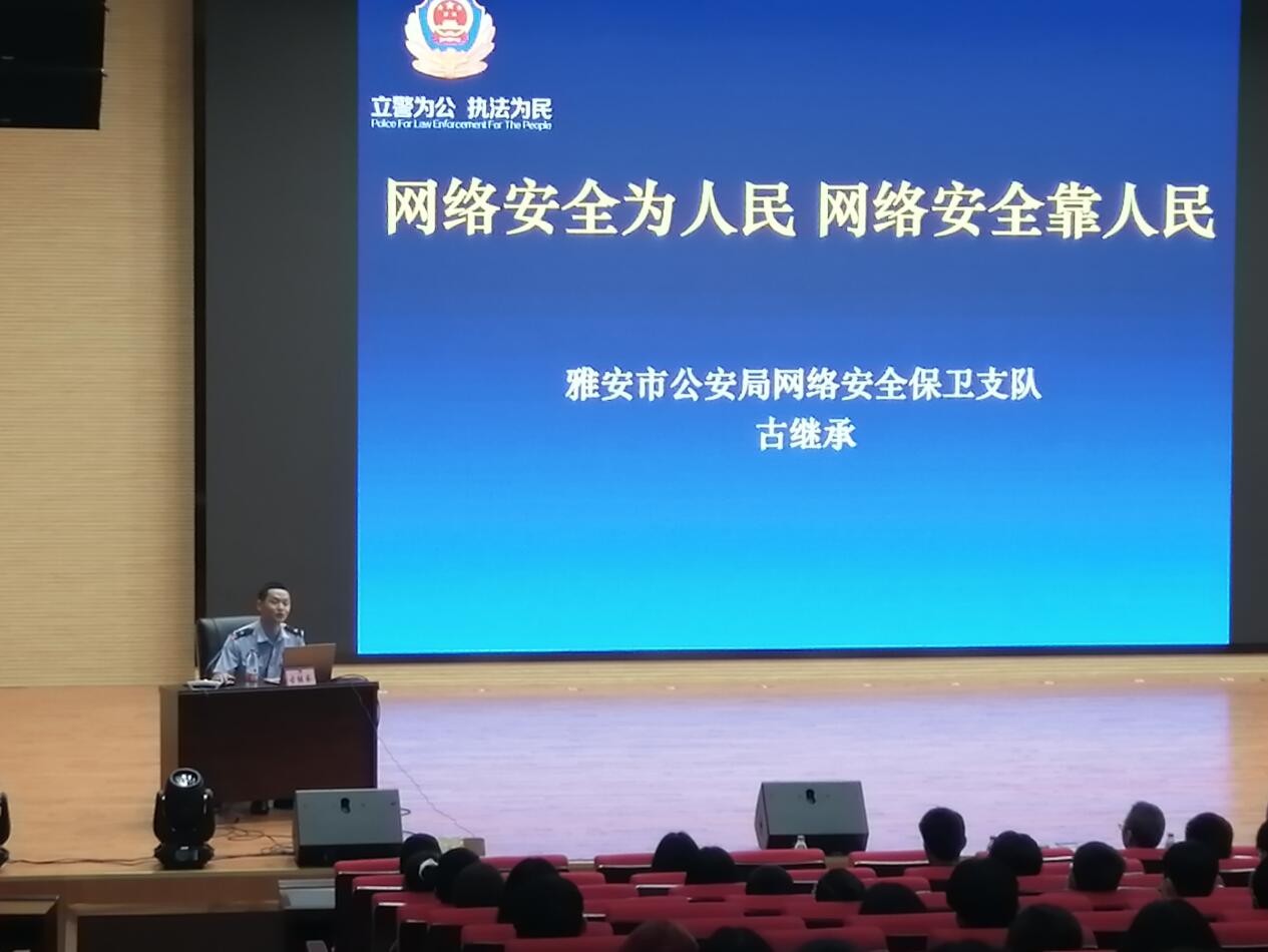 活动邀请了雅安市公安局网安支队民警古继承为学院170名师生和网络志愿者讲解了《网络安全为人民,网络安全靠人民》为题的专题讲座。从网络安全的重要性、网络安全相关法律知识、网络诈骗的防范与应对、网络安全意识的提高和网络安全需要共同参与维护等方面,用一个个鲜活的案例,引导大家正确认识网络、安全使用网络,提升网络安全意识和防范能力。