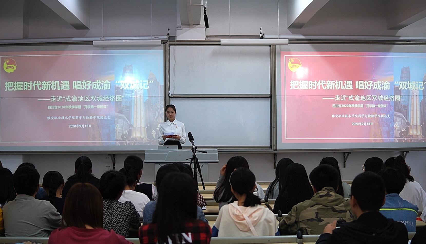 为提高学生干部和团员们的思想理论水平和政治素质,引导他们在本职岗位和社会生活中发挥模范带头作用,并深化社会主义核心价值观的学习与实践,9月20日下午14:30药学与检验学院在经开区2104多媒体教室开展了以“把握时代新机遇,唱好成渝‘双城记’”为主题的“开学第一堂团课”活动。药检学院学生会全体干部、各团支部干部及团员代表,共计约200人参加了此次活动。