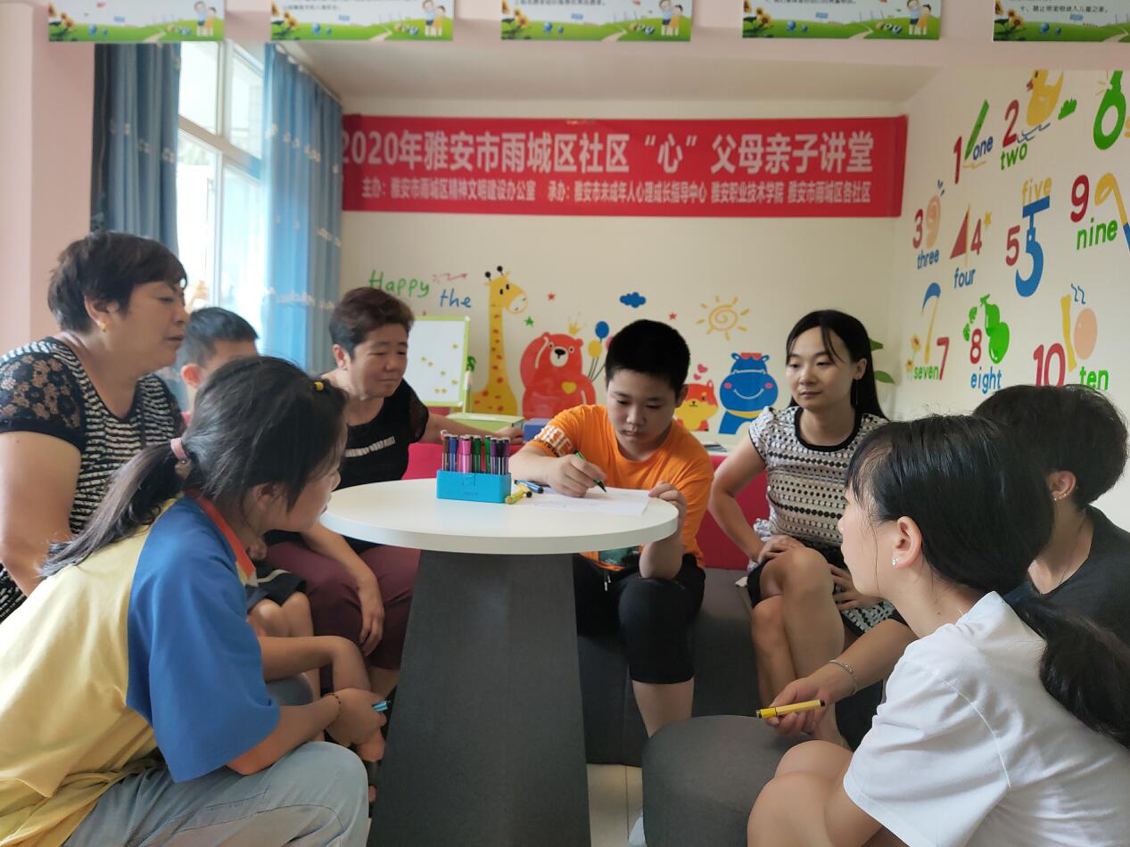 为进一步加强未成年人思想道德建设,架起孩子与家长沟通的桥梁,提升家庭心理健康服务水平,7月14日-7月23日,由雅安市雨城区精神文明建设办公室主办,雅安市未成年人心理成长指导中心、beat365英国官方网站承办的第一期“心”父母亲子讲堂在社区心理辅导点顺利举行。
