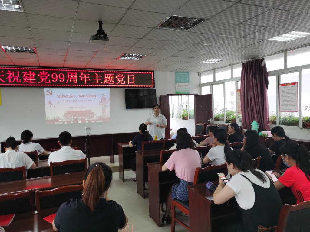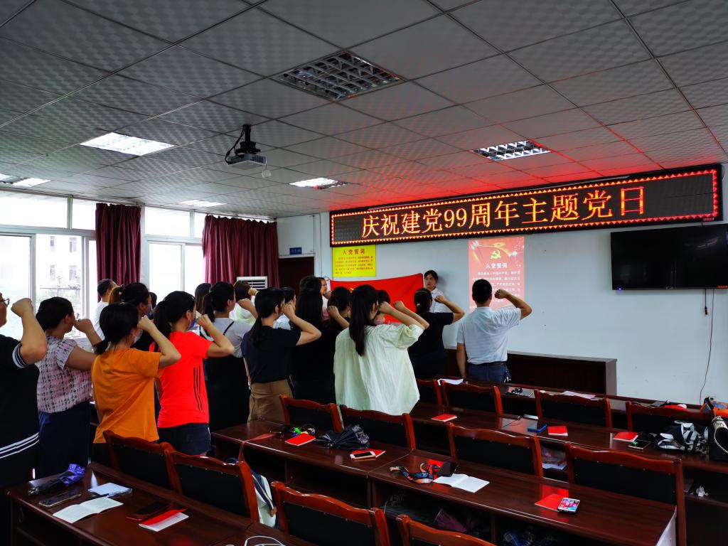首先,由刘忠建传达《中共雅安市委组织部关于开展庆祝建党99周年活动的通知》文件精神,提出活动要求。随后,由姚婕领誓,带领新党员宣誓,老党员重温入党誓词。随后,姚婕、叶芋伶分别以“坚定信仰,做合格党员”“坚守党员初心,筑牢纪律防线”为主题给党员们上党课,进行理想信念和党规党纪教育。最后党员们结合童朝辉同志事迹进行讨论分享,大家纷纷表示要坚定理想信念,守住党员初心,立足岗位职责,积极主动作为,起好党员的先锋模范带头作用。