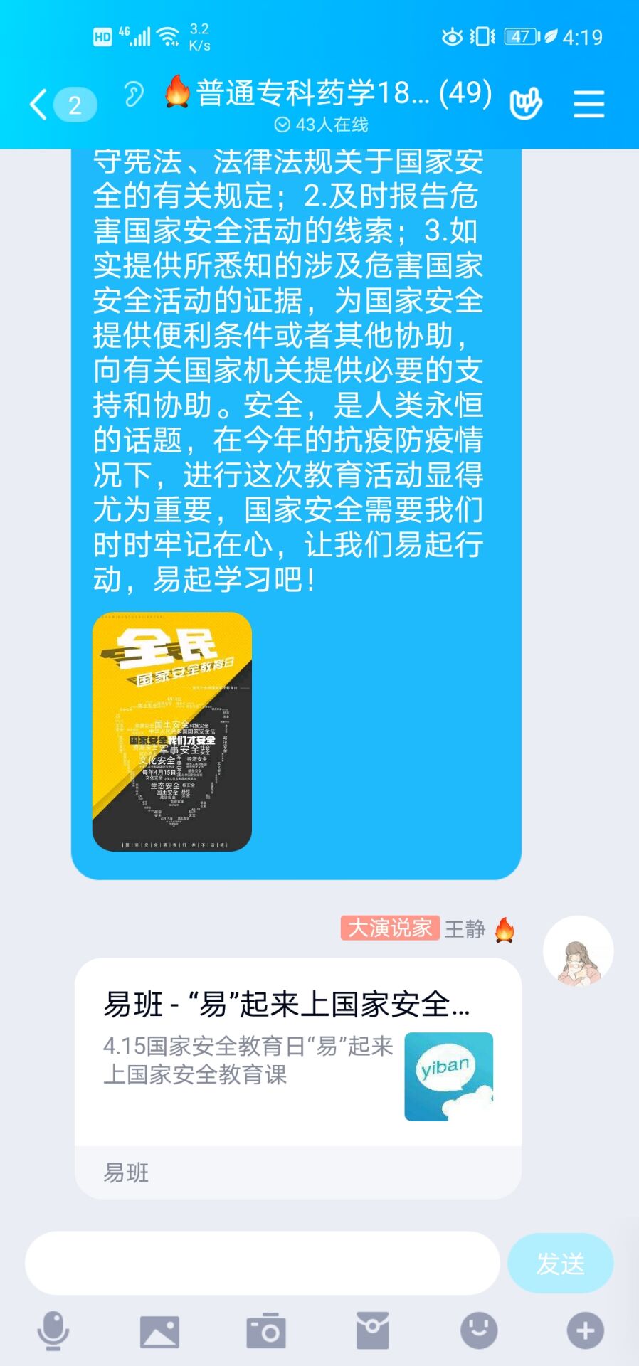 4月15日是第5个全民国家安全教育日,今年的教育主题是“坚持总体国家安全观,统筹传统安全和非传统安全,为决胜全面建成小康社会提供坚强保障”。学院易班发展中心结合当前疫情形式,通过线上网络平台组织全体学生“易”起来上国家安全教育课。通过易班平台、QQ群、微信群等广泛转发上课链接,转发国家安全教育日重点内容,引导广大学生深入学习习近平总书记总体国家安全观,增强维护国家安全的责任感和能力,增强同学们国家安全意识。通过学习,让广大学生明确树立“国家安全无小事,维护国家安全是每一位公民的神圣义务”的理念。