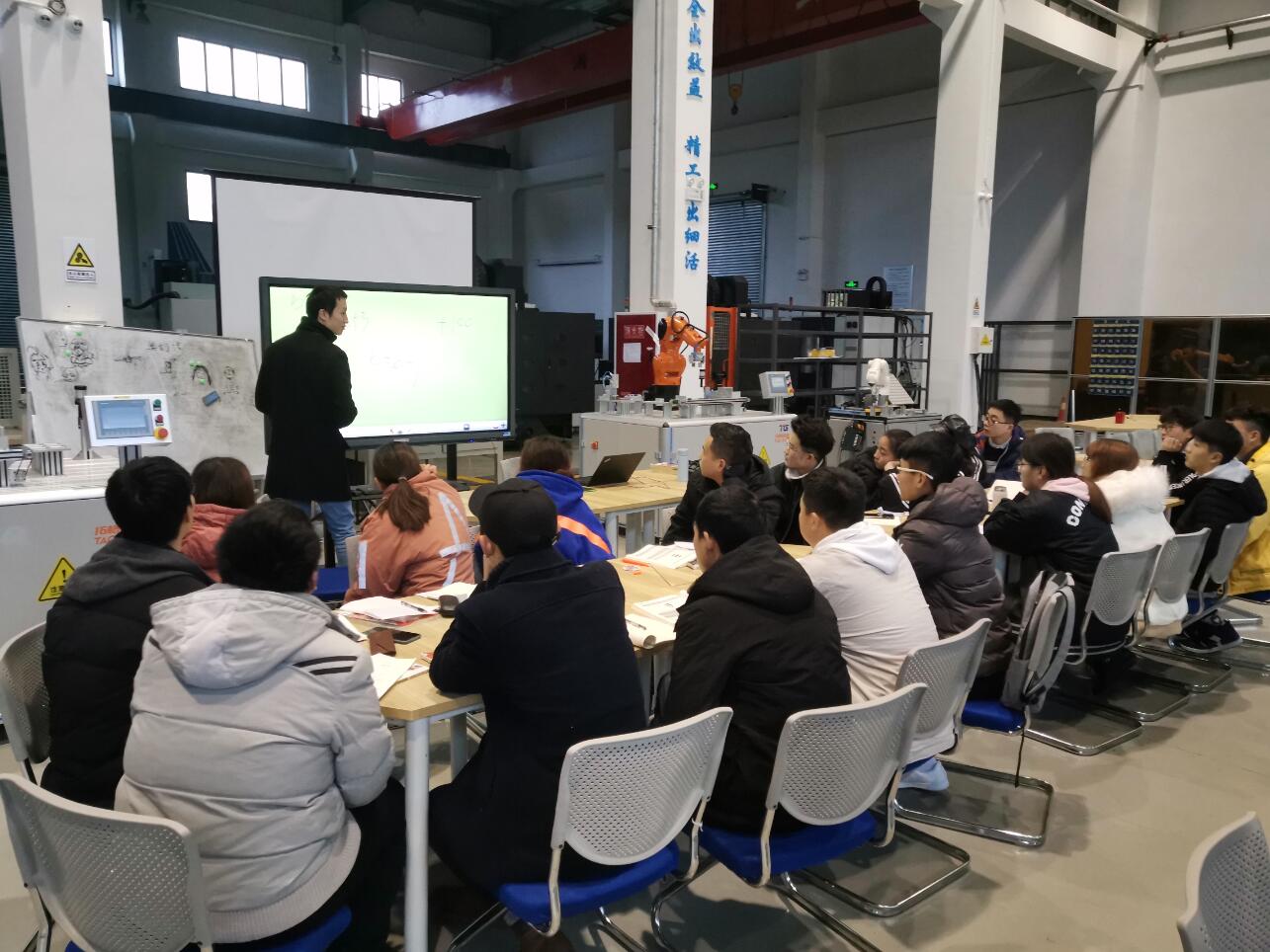 为更好地推动工业机器人技术专业后续课程中实施双项目分层次教学改革,弘扬工匠精神,鼓励学生树立更优更强的目标意识。智信学院联合四川拓格机器人科技有限公司于2019年12月30日至2020年1月5日对2019学年选拔、聘用的20名学生“教师助理”进行岗位能力强化集中培训。