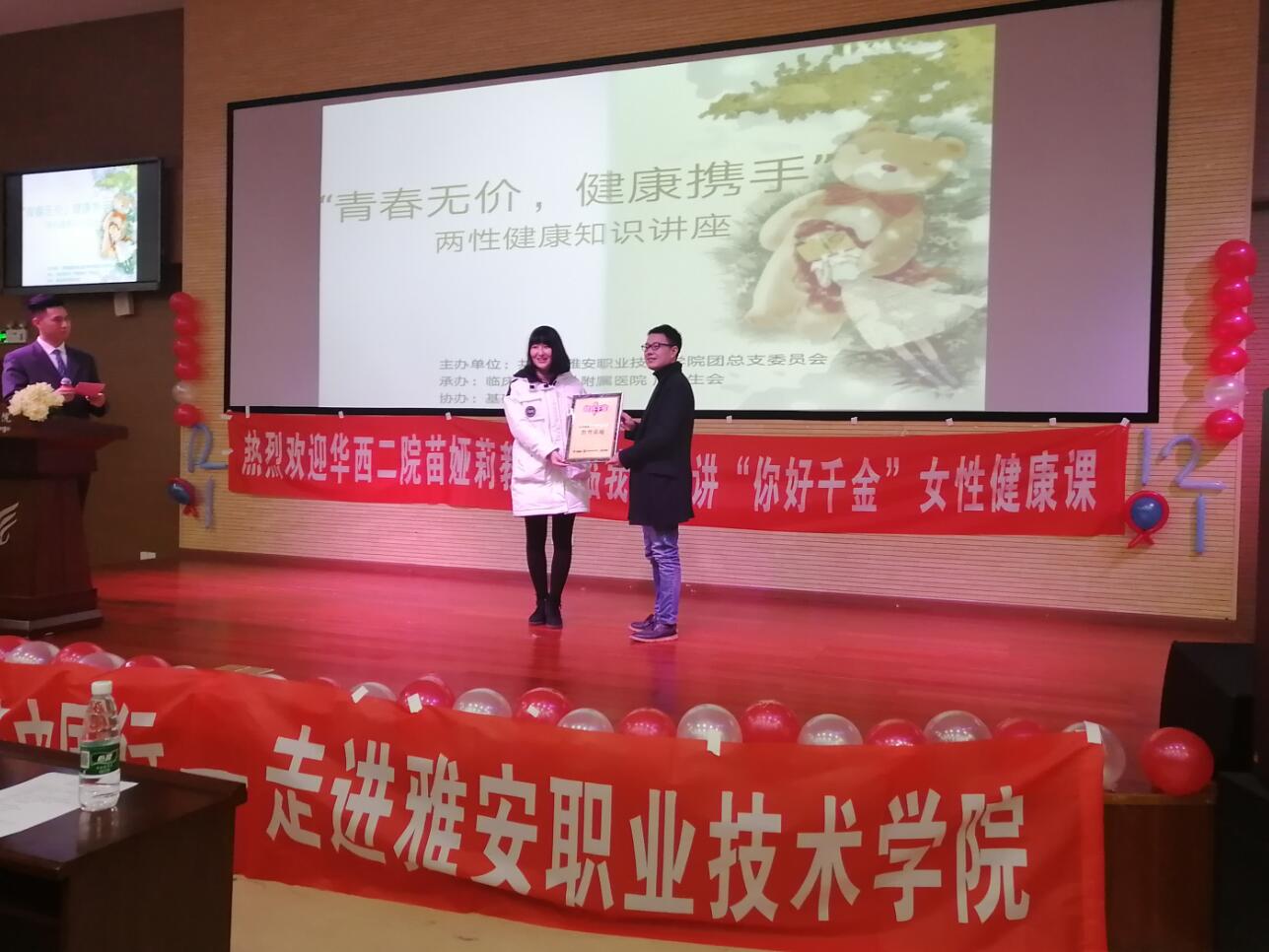 苗娅莉教授以四川地区艾滋病相关数据告诫同学们艾滋病的危害性和严重性,着重从月经、妇科炎症、宫外孕产生的原因以及危害、艾滋病传播途径和危害四个方面介绍了女生的健康知识以及如何预防艾滋病疾病。苗教授语言幽默风趣、理论讲授深入浅出,结合大学女生的临床案例又有很强的现实感,会场不时传来阵阵笑声。在解疑答难互动环节,各位同学踊跃发言,积极提问,苗教授作出了耐心专业的解答。讲座结束后,阳建武老师为我院授予 “女生健康中国行”公益活动教育基地的称号。活动最后,张晓惜老师总结讲话,告诫同学们要自尊自爱,洁身自好,增强自我保护意识,爱自己爱他人。