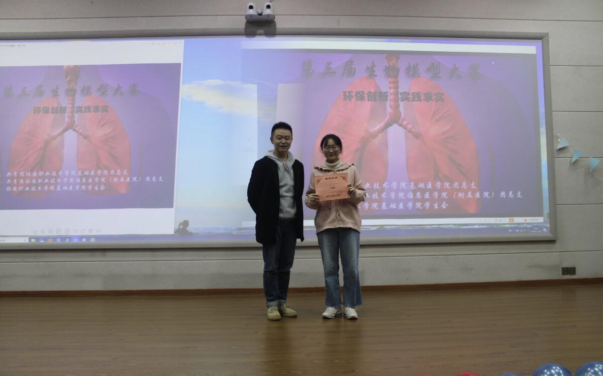 11月18日,基础医学院“环保创新,实践求实”第三届生物模型大赛决赛在经开区实训与服务中心2204多功能厅举行。基础医学院党支部书记孙玉锦、院长薛正毅、副书记张翅、副院长邓良超、临床医学院(附属医院)副院长杨志伟、基础医学院团总支书记赵武博,辅导员刘晶晶、严一峰、母欧阳、李灵敏及学管干事杨芳莅临并担任评委,现场共计100余名19级新生参与。