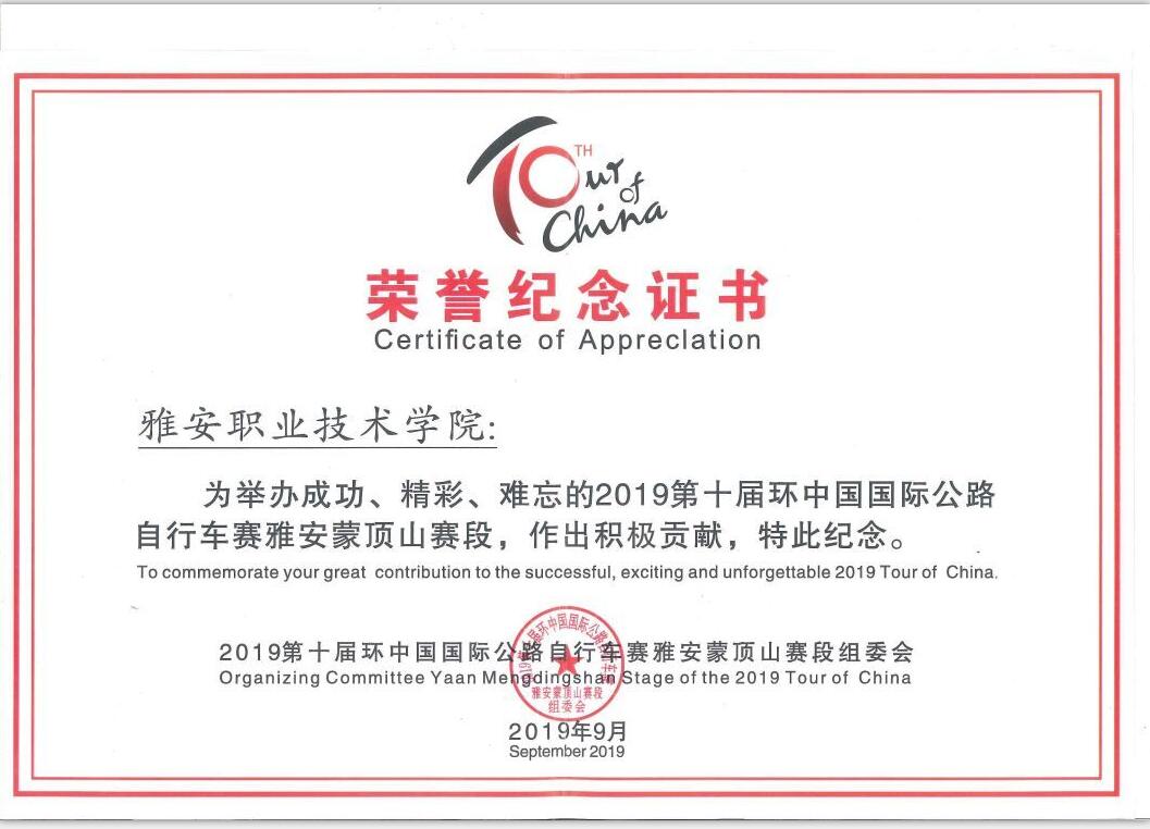 “环中赛”蒙顶山赛段,学院80名志愿者在整个赛段的志愿服务过程中高度负责、认真执勤。他们辛勤而无悔的为大赛服务,一不怕苦,二不怕累。雅职志愿精神得到了蒙顶山赛段组委会的高度赞扬,组委会特向学院颁发了荣誉纪念证书,每一名志愿者也得到了属于自己的荣誉证书。