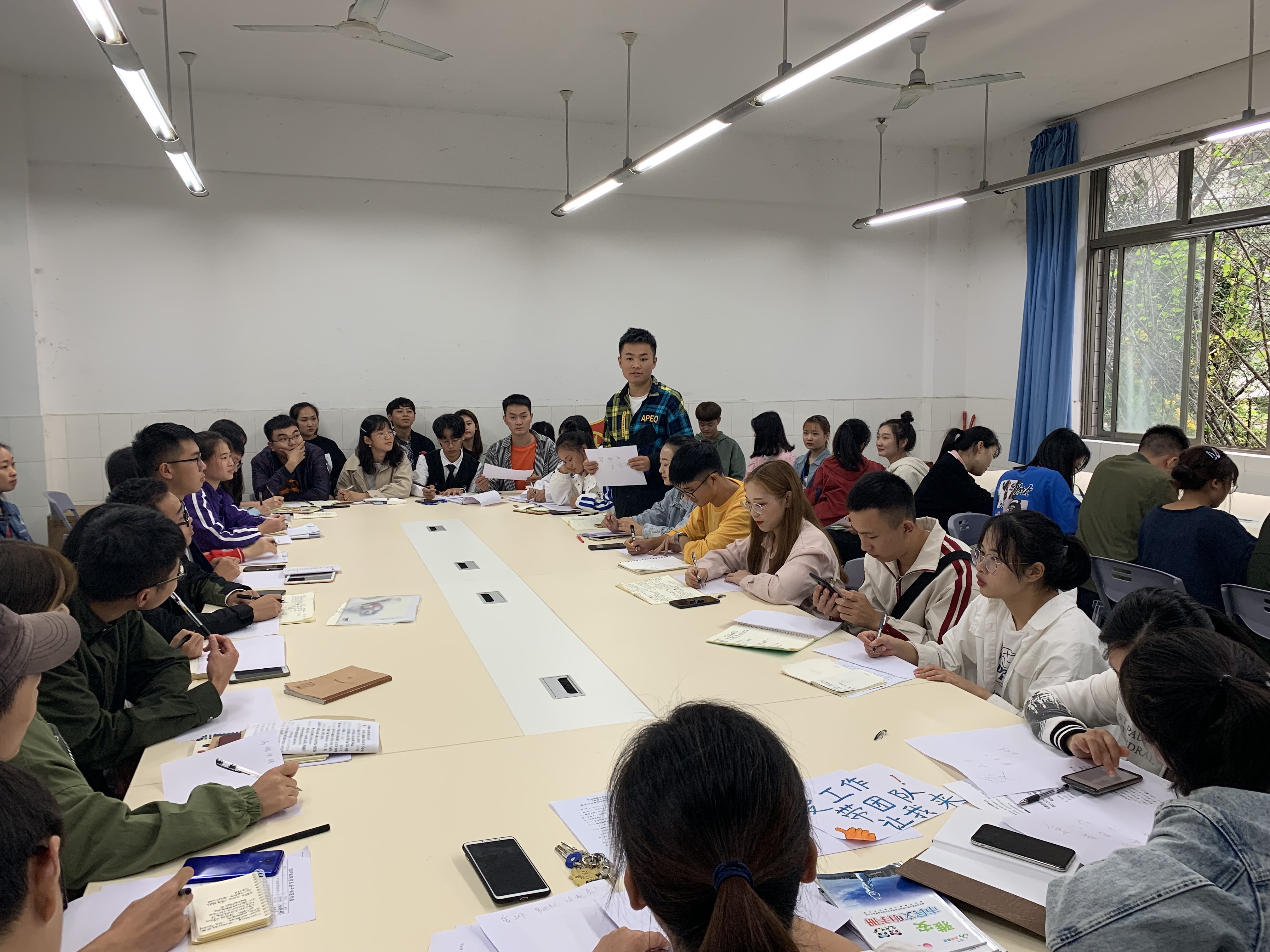 会议最后,刘永恩老师组织大家开展了一次“团建”活动,让大家在思考工作之后,用一句话总结前期工作的感受,并于身边的同伴进行分享,在得到同伴的一句话肯定后,增强了前行的动力。现场的老师和同学经过深入走心的交流后,老师们给出了“爱工作,带团队,让我来!”,全体同学学生干部给出了“任务给我,团队给我,请看我的!”郑重承诺。
