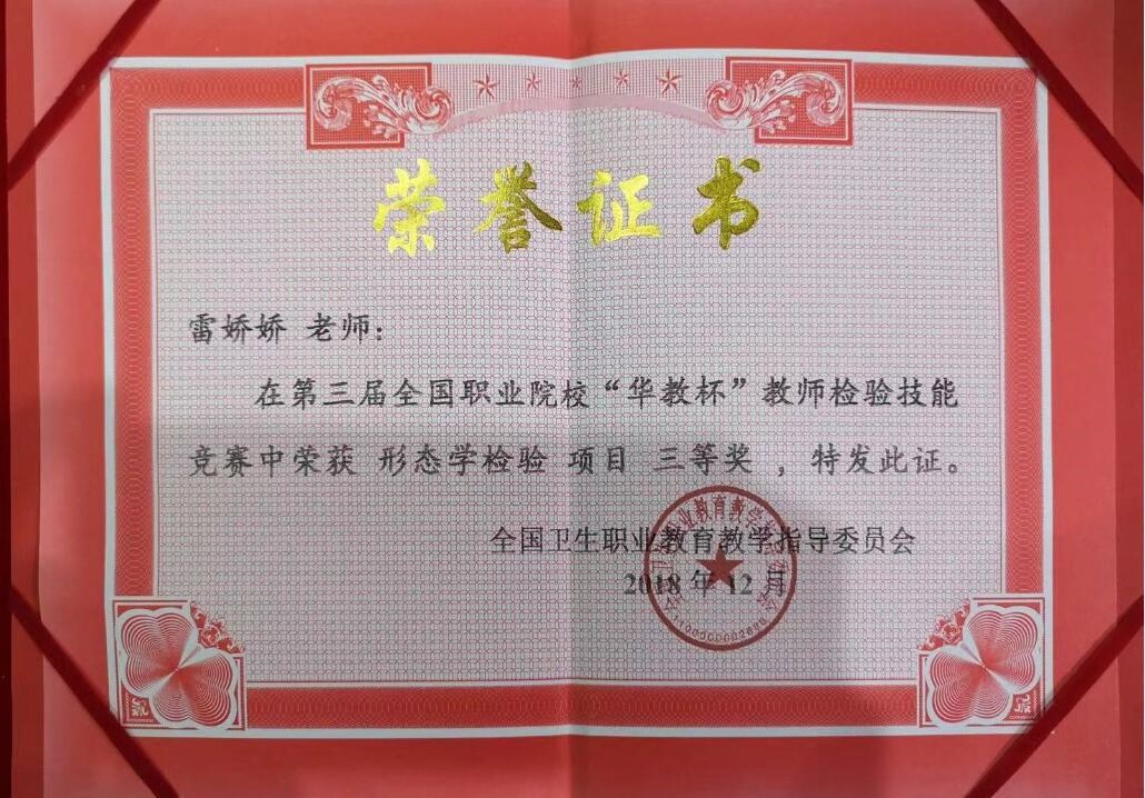 【本网讯】近日,全国卫生职业教育教学指导委员会举办的第三届全国职业院校“华教杯”教师检验技能竞赛在扬州职业大学举行。本次比赛采用手工法操作,共设有血液常规检验、生化检验、细菌分离技术与革兰染色及细菌鉴定思路、形态学检验及骨髓片观察诊断、免疫学检验共5个项目,我院雷娇娇、陆小琴、康雪三位老师分别获得形态学检验及骨髓片观察诊断三等奖、免疫学检验优秀奖、血液常规检验优秀奖。