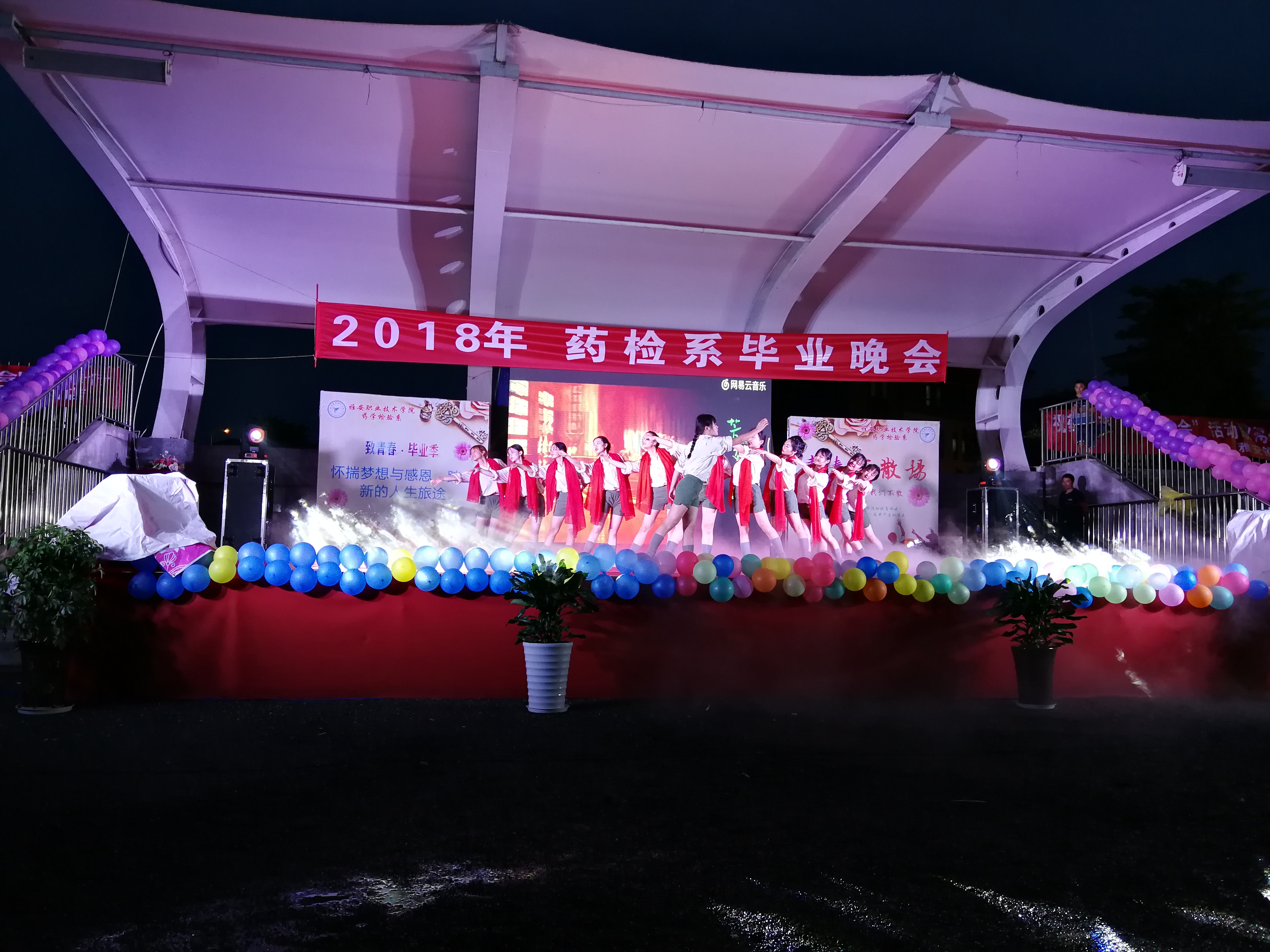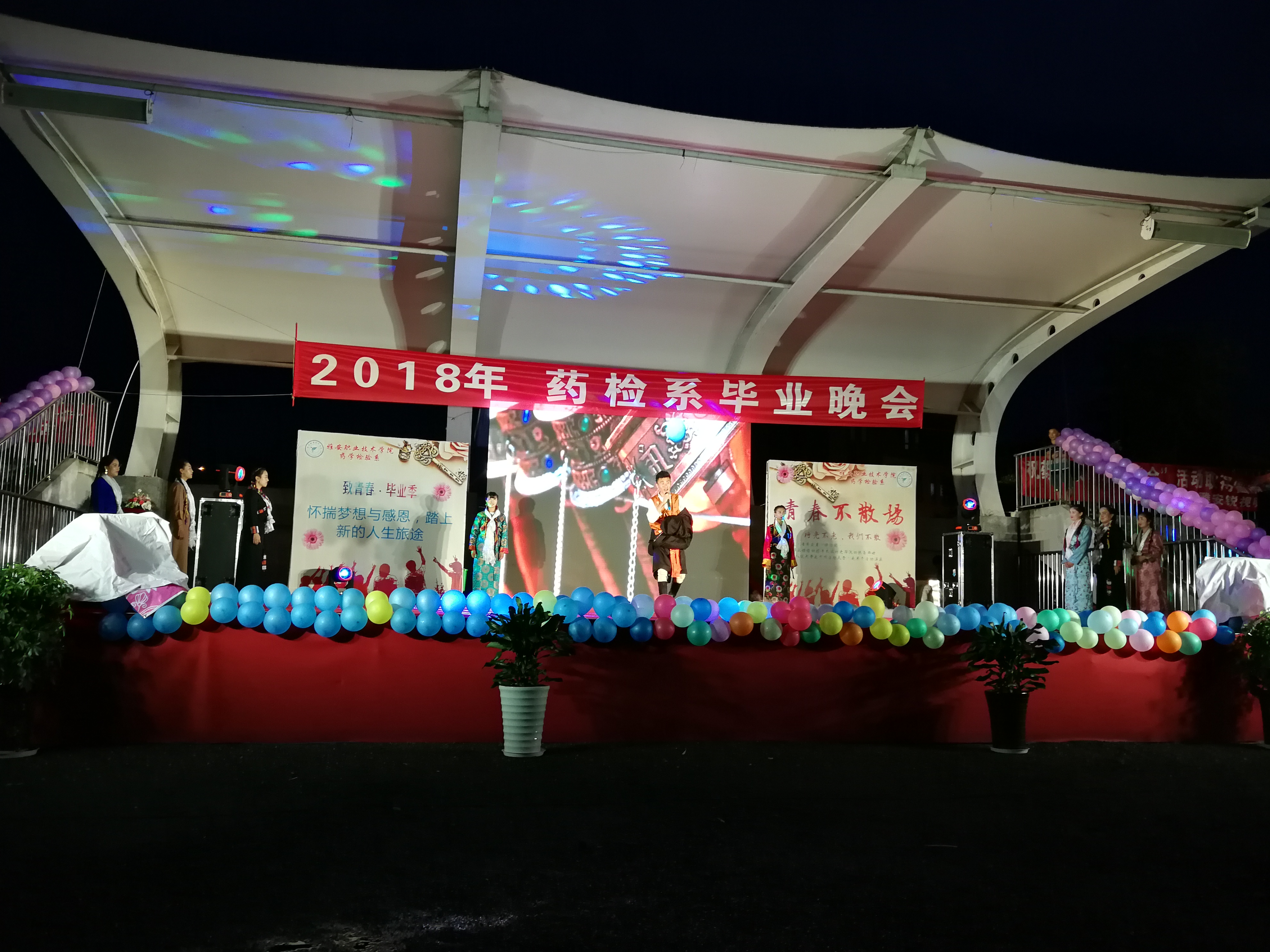 【本网讯】花开半夏,正值年华,笑语欢声,吹响了毕业号角,为了欢送药检系毕业生和实习生,6月25日晚,药学检验系团总支学生会在实训与服务中心足球场举行了以“一路芳华,浓怡感恩”为主题的欢送晚会。教务处处长兼药检系主任彭裕红、系党支部书记杨泽刚、系副主任李成忠、团总支书记(副书记)、系全体辅导员、部分专业老师,各系学生会主席团、药检系2017级同学、2016级的实习同学、赞助商代表以及部分2015级毕业生等共计2000余人观看了晚会。