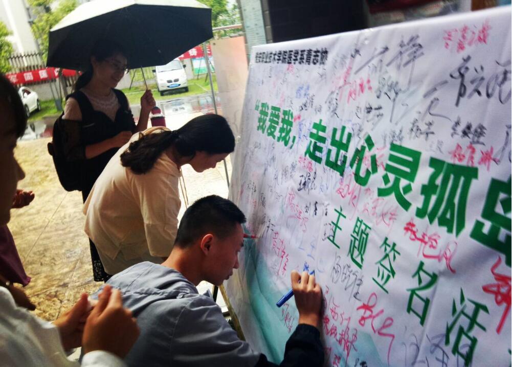 上午11点,活动准时开始。志愿者们身穿红色马甲穿梭在蒙蒙细雨中,邀请同学们在“我爱我,走出心灵孤岛”的签名版上签下自己的名字,表示“我爱我”是对爱我的和我爱的人最好的交代。雨一直在下,但志愿者们仍然热情高涨,路过的同学们也纷纷停下匆忙的脚步,在签名板上郑重落下自己的一笔承诺。