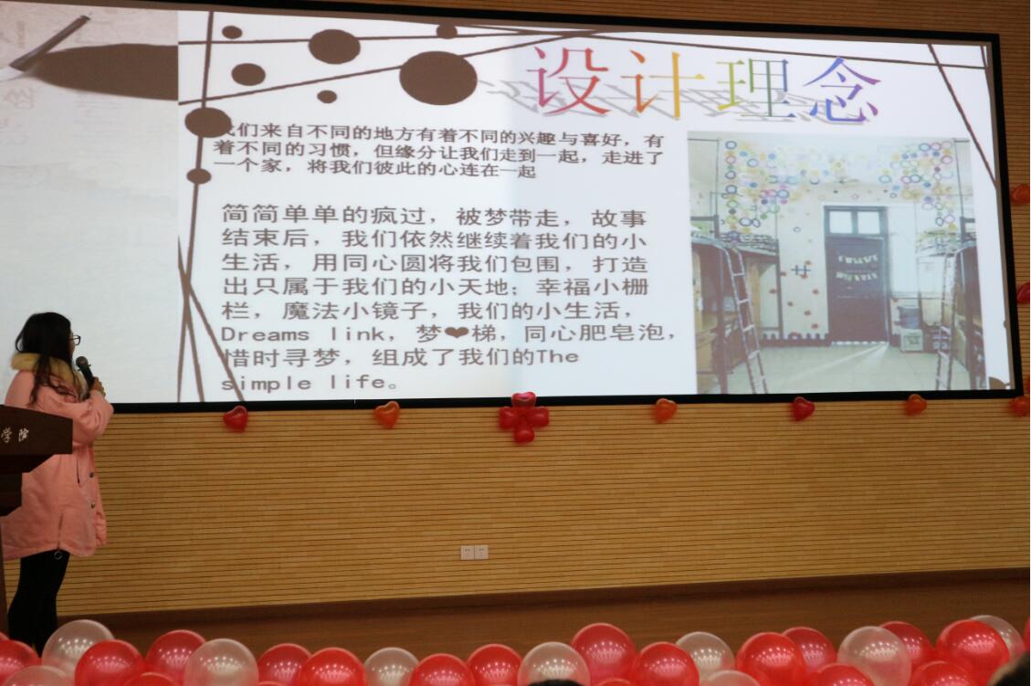 首先,主持人公布各参赛寝室赛前微信投票的结果。随后,参赛选手按抽签顺序依次上台,通过PPT讲解寝室文化设计理念。同学们独具匠心地将废纸、落叶等改造为精美的剪贴画。3-224寝室“盘识洞”,同学们用银杏树叶装饰掉漆的墙角,别出心裁的设计引得了观众们的阵阵掌声;4-609寝室“小猪佩奇邂逅四季”,同学们用卡通涂鸦营造出温馨美好的氛围。最终, 3-418、2-324、4-604寝室荣获一等奖,2-209、3-319等6个寝室获二等奖,3-224、3-407等9个寝室获三等奖。