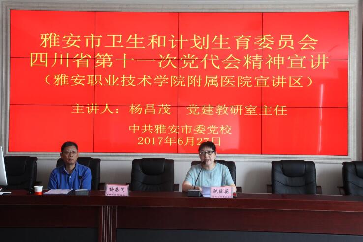 【本网讯】为更好学习、宣传、贯彻四川省第十一次党代会精神,根据《中共雅安市卫计委委员会关于开展学习贯彻省第十一次党代会精神宣讲工作的通知》要求,beat365英国官方网站附属医院于2017年6月27日下午在门诊大楼十楼学术厅举行省第十一次党代会精神宣讲会。市委宣讲团成员、市委党校党建教研室主任杨昌茂副教授主讲,附属医院及医学系党员师生共110余人参加了此次宣讲会。会议由附属医院、医学系党支部书记祝继英主持。