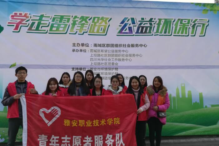 【本网讯】为了贯彻落实“文明三月,学雷锋”的号召,提高教育系学子“奉献、有爱、互助、进步”的志愿服务精神,3月5日,值学习雷锋活动日当天,教育系志愿服务分队参加了由雨城区群团组织社会服务中心举办的主题为“学走雷锋路,公益环保行”的活动。