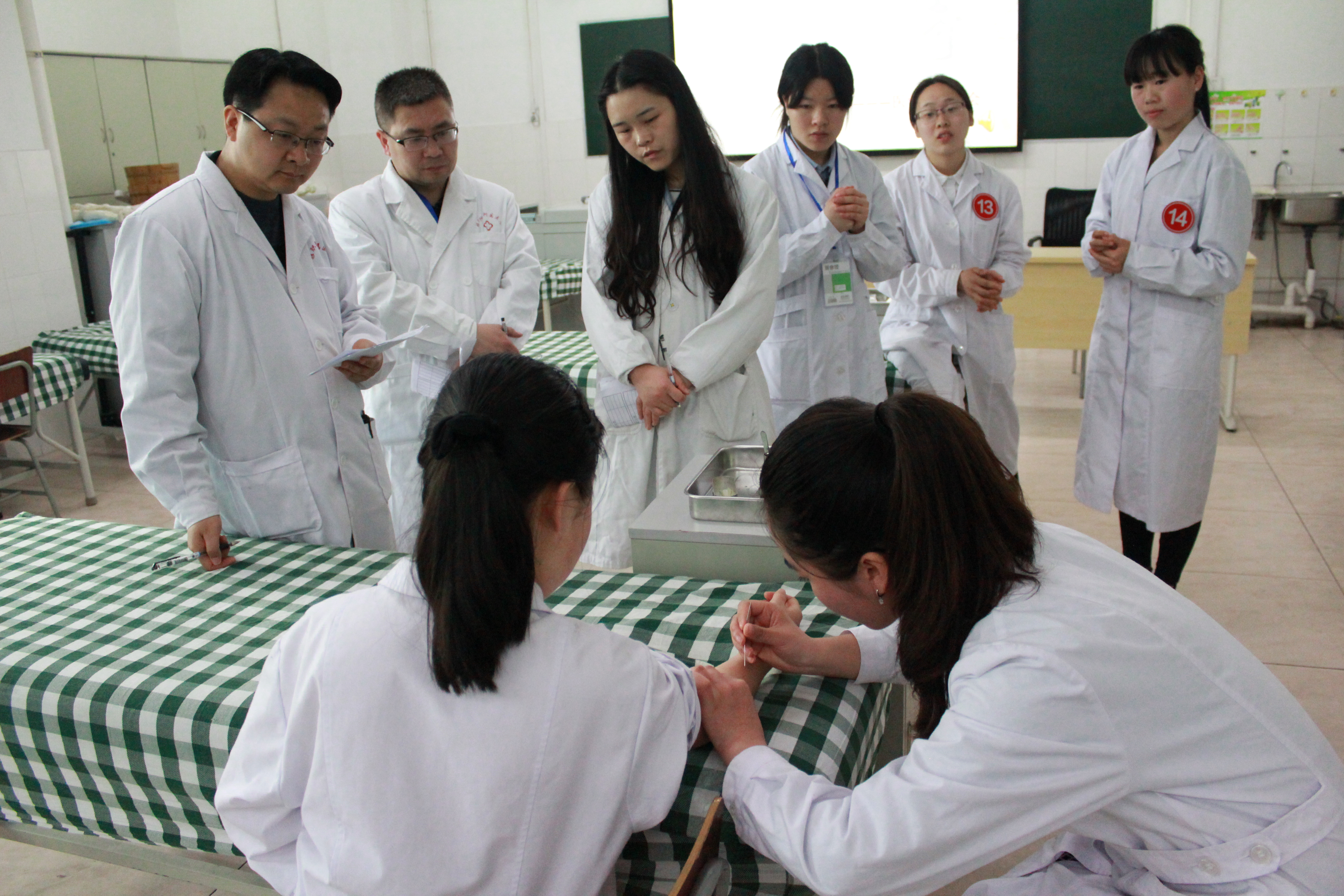 比赛通过现场抽签,每两名参赛选手分成一组,互扮医生和病人,模拟临床诊疗操作情景。比赛重点考察腧穴的定位、主治作用、配伍应用及针刺操作等内容。