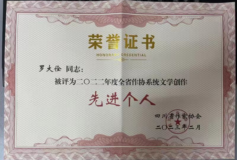 近日,四川省作家协会第九届全委会第三次全体会议在成都召开,会议表彰了2022年度全省作协系统先进集体和先进个人,学院工会副主席罗大佺荣获“2022年度全省作协系统文学创作先进个人”。