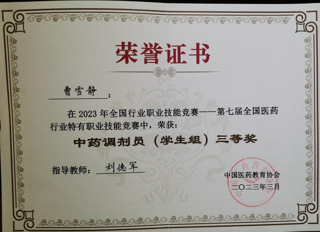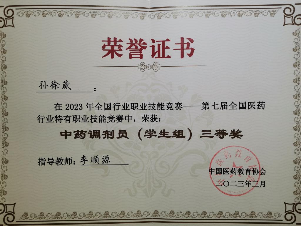 3月24日至26日,由中国医药教育协会、中国就业培训技术指导中心主办的“2023年全国行业职业技能竞赛第七届全国医药行业特有职业技能竞赛中药调剂员赛项”在江苏省连云港中医药高等职业技术学校举行,来自全国的61所院校和10家行业企业,共计79支参赛队伍198名选手参加比赛。经过激烈的角逐,药学与检验学院普专中药学专业2020级学生曹雪静、孙徐葳斩获个人赛三等奖,学院荣获单项团体三等奖和优秀组织奖。