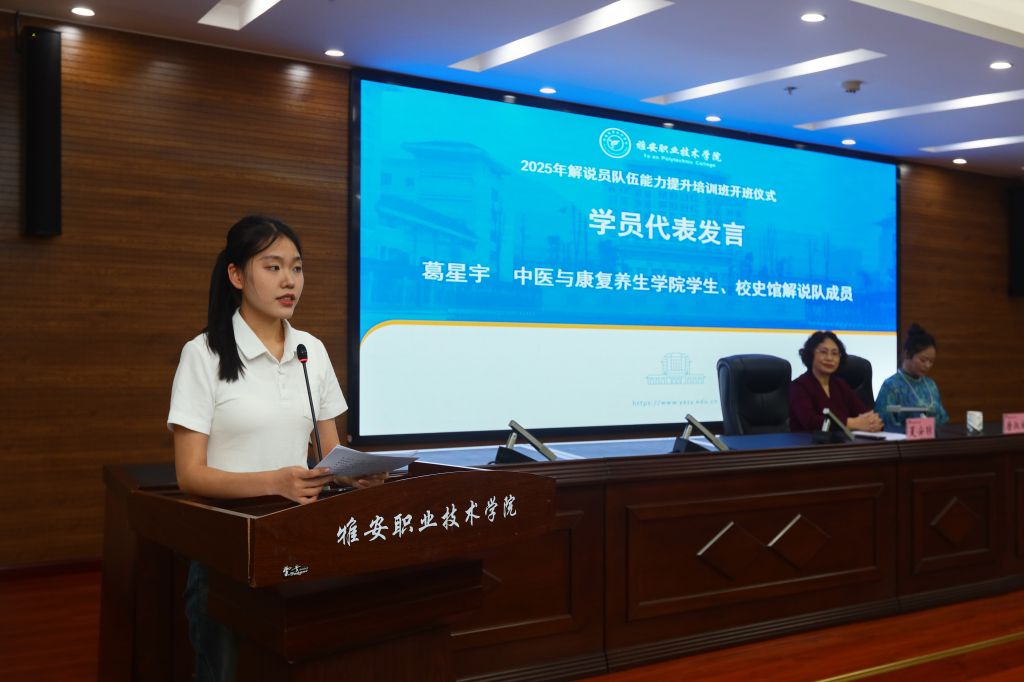 来自中医与康复养生学院的葛星宇作为学员代表发言。她表示,解说员不仅是雅职校园文化的宣讲者,更是校园文化的传承者,期待通过此次培训,掌握更多的专业知识、实战的方法技巧,让每一次讲解都成为“有温度的对话”。