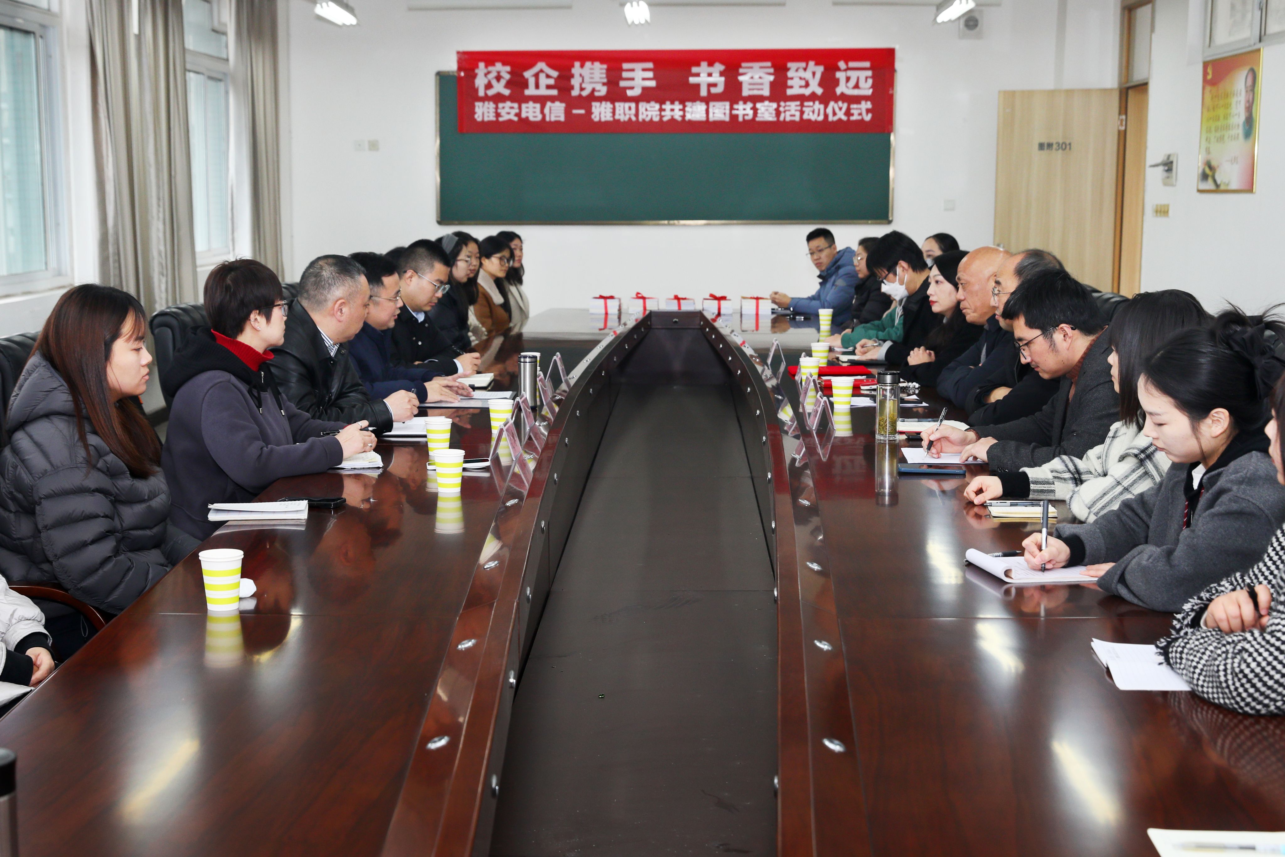 仪式上,学校向中国电信雅安分公司工会主席王大江颁发了图书捐赠证书。随后,校企双方代表现场签署了共建图书室合作协议。双方还围绕未来合作方向、资源共建共享等议题进行了深入交流。