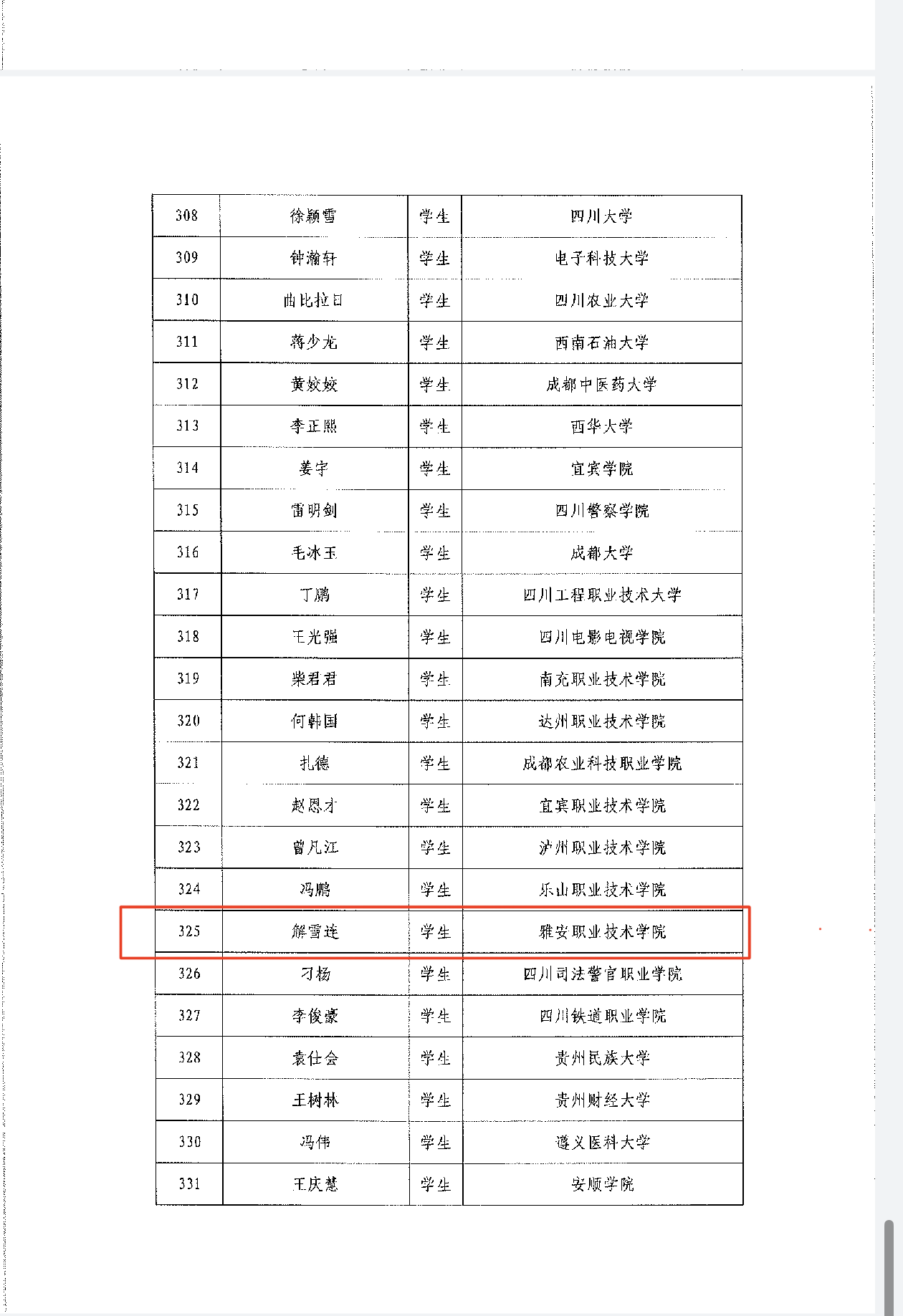 近日,教育部、中国教育发展基金会公布2024-2025年度“高校毕业生基层就业卓越奖学(教)金”名单,今年全国418名毕业生获得此项荣誉,四川省高校毕业生有20人获得,其中仅有9所高职专科院校毕业生入选,beat3652017级护理专业毕业生解雪连位列其中。