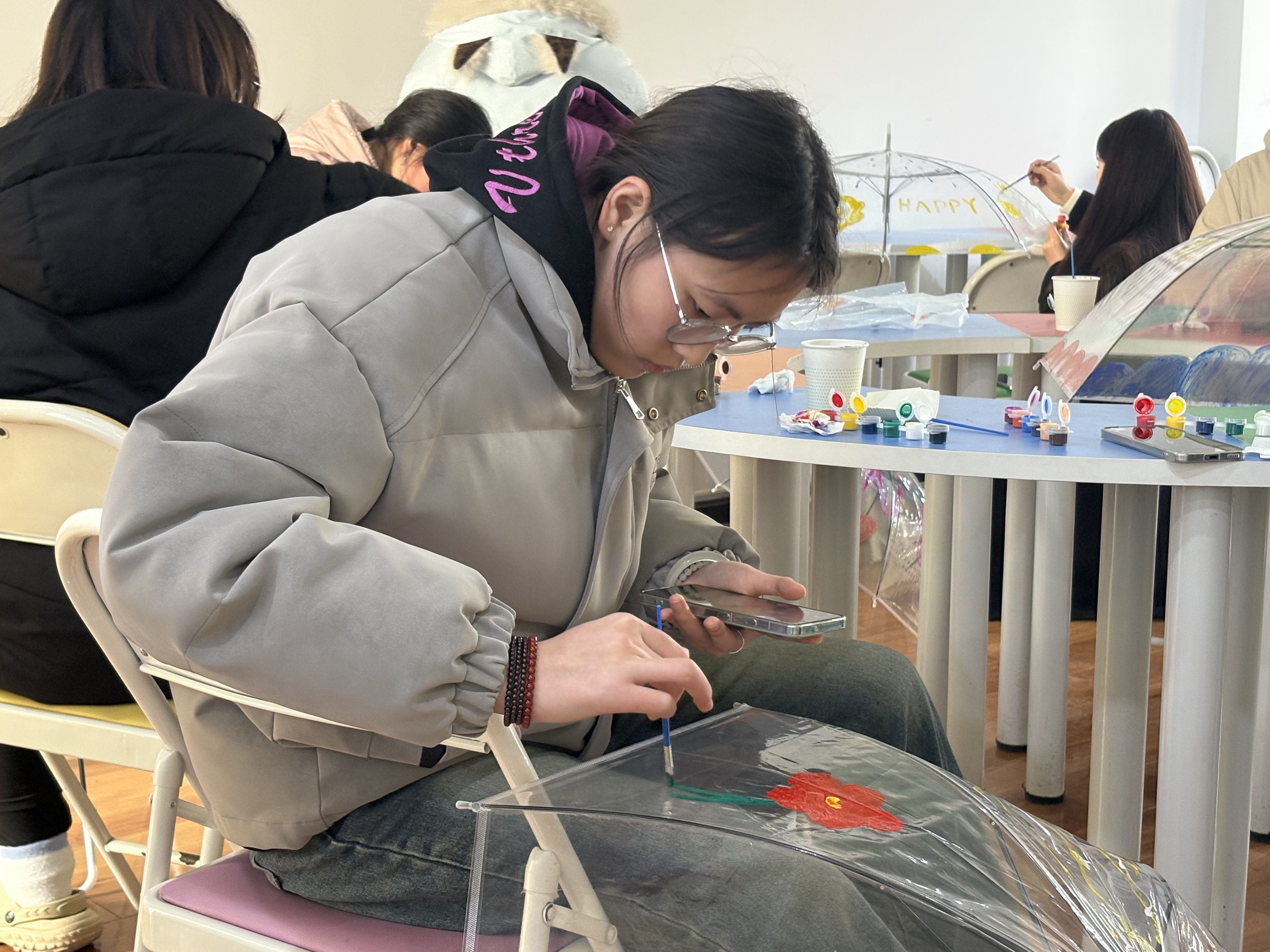 本次活动以彩绘透明雨伞为艺术疗愈载体,通过色彩表达与创意交流,搭建情绪表达与朋辈支持平台,引导学生在温暖互动中悦纳自我、积极生活。活动在冬日暖阳中拉开序幕,心理中心教师首先以“心灵天气猜猜猜”游戏暖场,活跃气氛并自然引入主题。随后,学生在伞面上自由创作,并通过作品分享背后的情感故事与心灵感悟。活动为学生提供了情绪表达与疏导的契机,也在互动交流中营造了温暖支持的良好氛围,助力学生积蓄心灵能量。