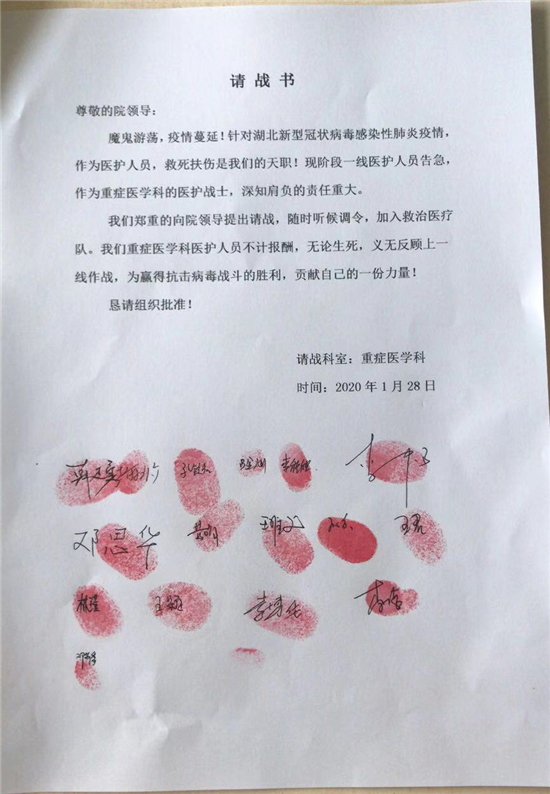 “我是党员,我报名!”“我参加军事演习,身体素质好,到前线我报名!”“到武汉支援,我们科室报名。如果去不了,我们愿意支援每个科室”……在请战书中,各科室人员纷纷表达了“听从召唤、履行天职、勇于担当、精诚合作”的心声,表示“若有战、召必回”。大家自愿加入到医院应对新型冠状病毒肺炎的各项工作中去,场面让人泪目。