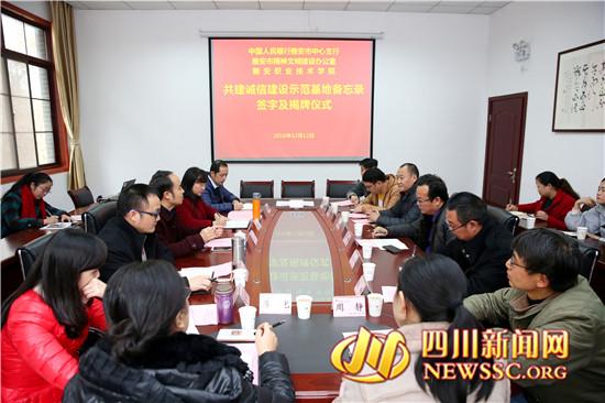 四川新闻网雅安12月14日讯(雅职院 图/文)12月12日上午,雅安职院与中国人民银行雅安市中心支行、雅安市精神文明建设办公室校地合作共建诚信建设示范基地备忘录签约及揭牌仪式顺利启动,活动在雅安职院育才路校区B211会议室举行。雅安职院党委书记张大凯、党委副书记付洪涛、党委委员副院长樊先茂,中国人民银行雅安市中心支行副行长罗洵、征信管理科科长张小春、宣传科科长郑勇、征信管理科干部周静,雅安市委宣传部副部长市文联主席寇青,雅安市精神文明建设办公室副主任唐世平、综合科科长张锦,以及雅安职院宣传统战部、思政部、院团委等部门负责人出席了此次合作签约揭牌仪式。签约会由付洪涛主持。