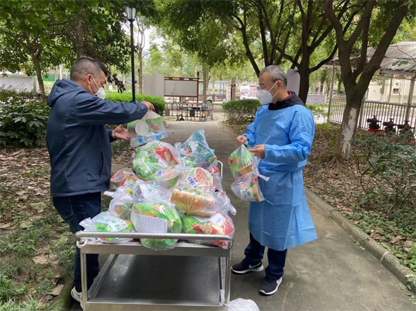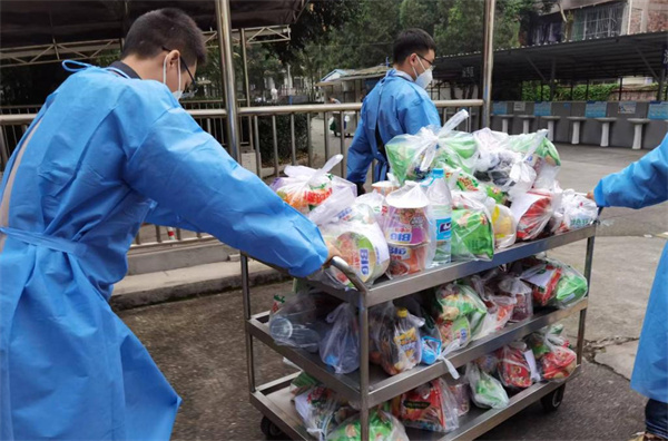 早上7时50分,生活老师们穿戴好防护服、戴好口罩,准时地来到食堂集合,开始一天的志愿工作。早上8:00到下午18:30的这段时间里,十余名教师志愿者严格按照时间节点,分工协作,陆续完成三餐配送、超市点买物品配送、桶装用水配送、生活垃圾收拾等工作,教师志愿者们有条不紊地在“食堂——学生公寓”之间穿梭,坚持着“两点一线”的工作生活模式。